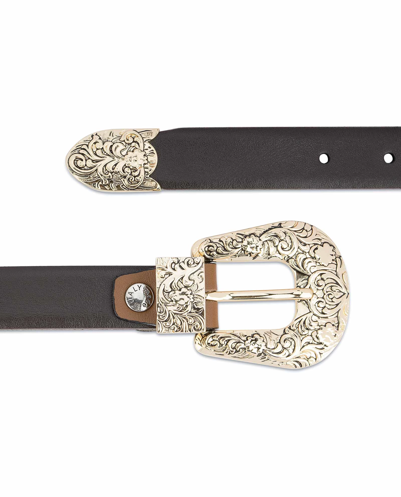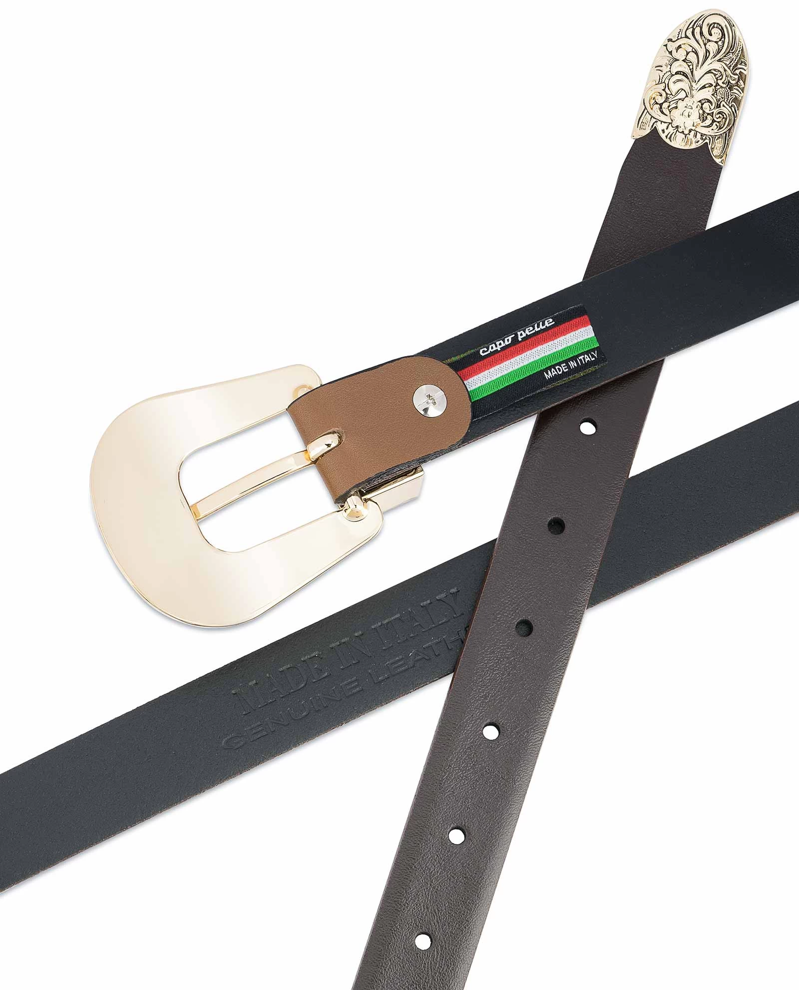 One inch brown western women’s belt with gold buckle is an amazing item handmade by the luxirious Capo Pelle brand. This exclusive women’s leather belt was produced in Italy; its height is 1.0″ (2.5 cm). This western leather belt is high-quality and exclusive – produced in deep brown color (that is considered to be one of the most elegant and fashionable colors of the year) and decorated with a gold colored, shiny buckle.