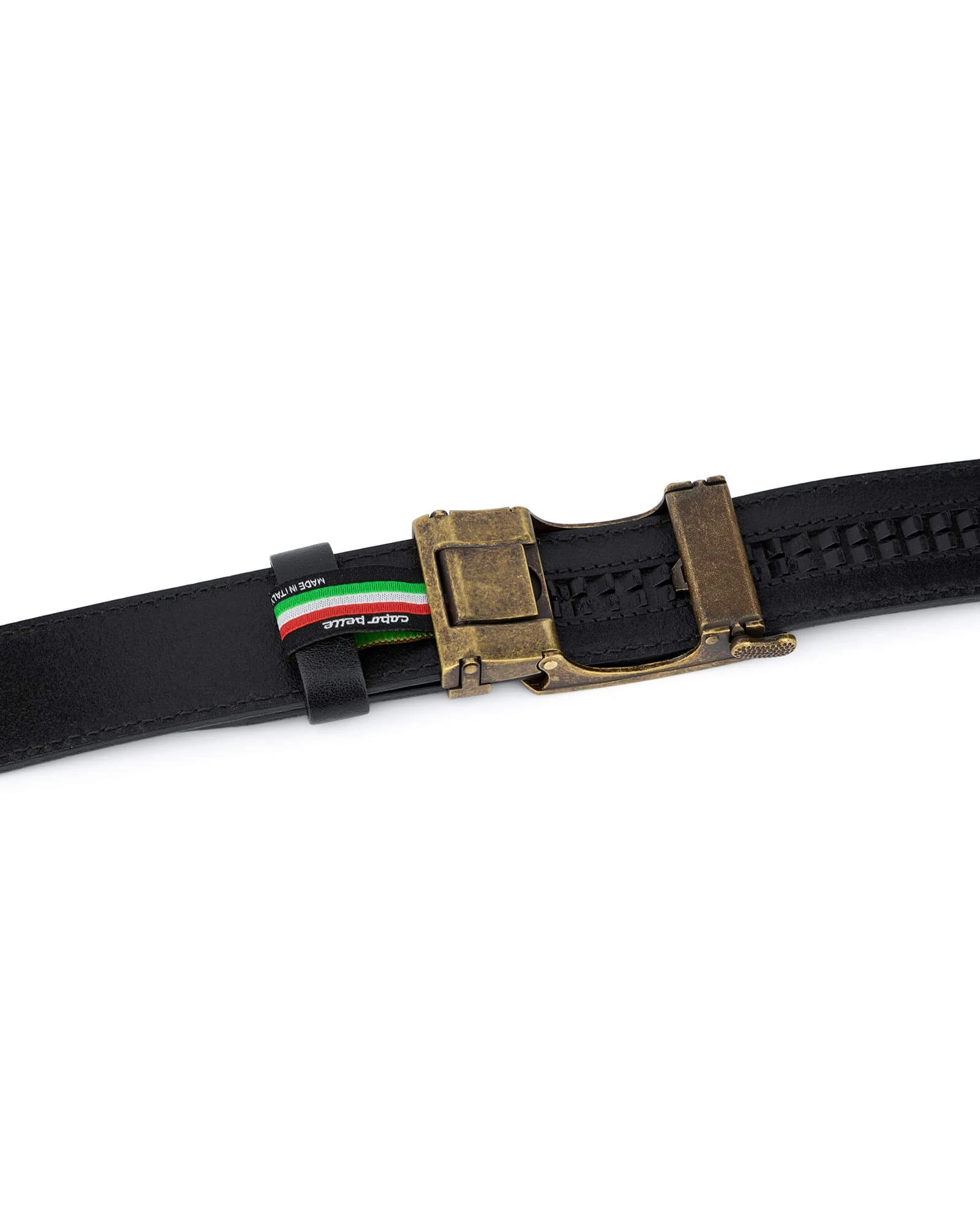 The belt in one color with the shoe or bag gives a complete look to the overall outfit. Take advice into account when buying a belt. The Capo Pelle craft masters have used 100% genuine Italian leather creating this model. The leather canvas is dyed in black color on both sides, doesn’t leave marks on clothing regardless of the dark color, and has no chemical odor. The click-it belt is firmly stitched with black threads for better durability and a complete look. The strap is available in 1 3/8″ / 3.5 cm. The only detail adorned the strap is an automatic buckle of bronze color with a fine mesh pattern. You just need to insert the belt strap with the ratchet line into the automatic buckle to fasten the belt. The mechanism will securely lock it in the desired place. Press the button on the buckle and pull out the strap if you want to come to free it from the closed position. As you see, it’s easy and quite convenient for fastening the belt.