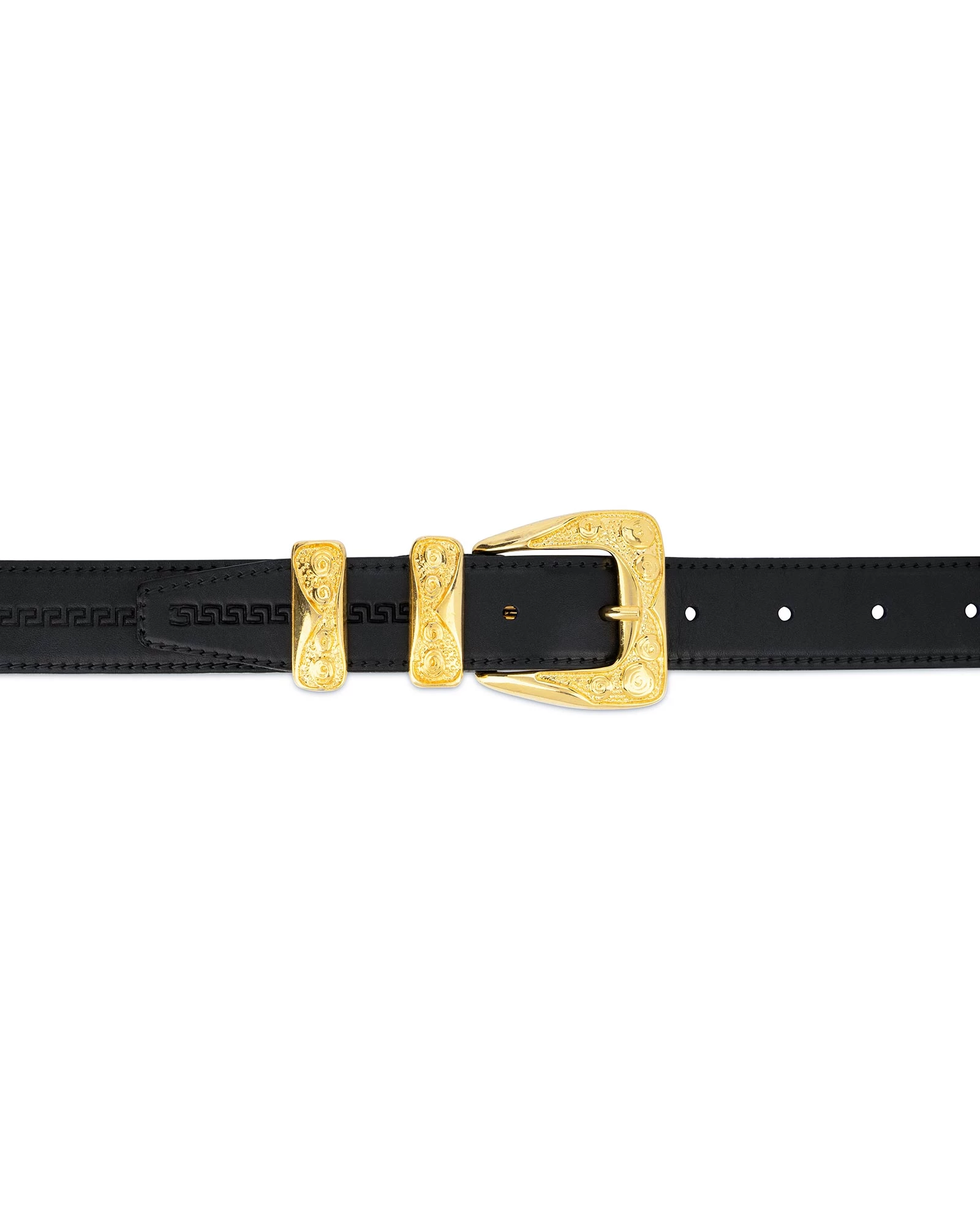 A black belt with a gold buckle in full-grain leather is a masterpiece of Italian designers of the Capo Pelle brand! It is designed for women who love to be fashionable and stand out in a crowd. The model is available in 1 1/8″ | 3.0 cm width. It is made of genuine full-grain Italian leather and dyed in black color. The belt doesn’t fade or crack. Some pre-cut holes for buckle tongue are enabled to adjust the belt to a comfortable position on the waist. The leather canvas is stitched with black threads for better durability and decorated with an embossed pattern in the Greek style along its length.