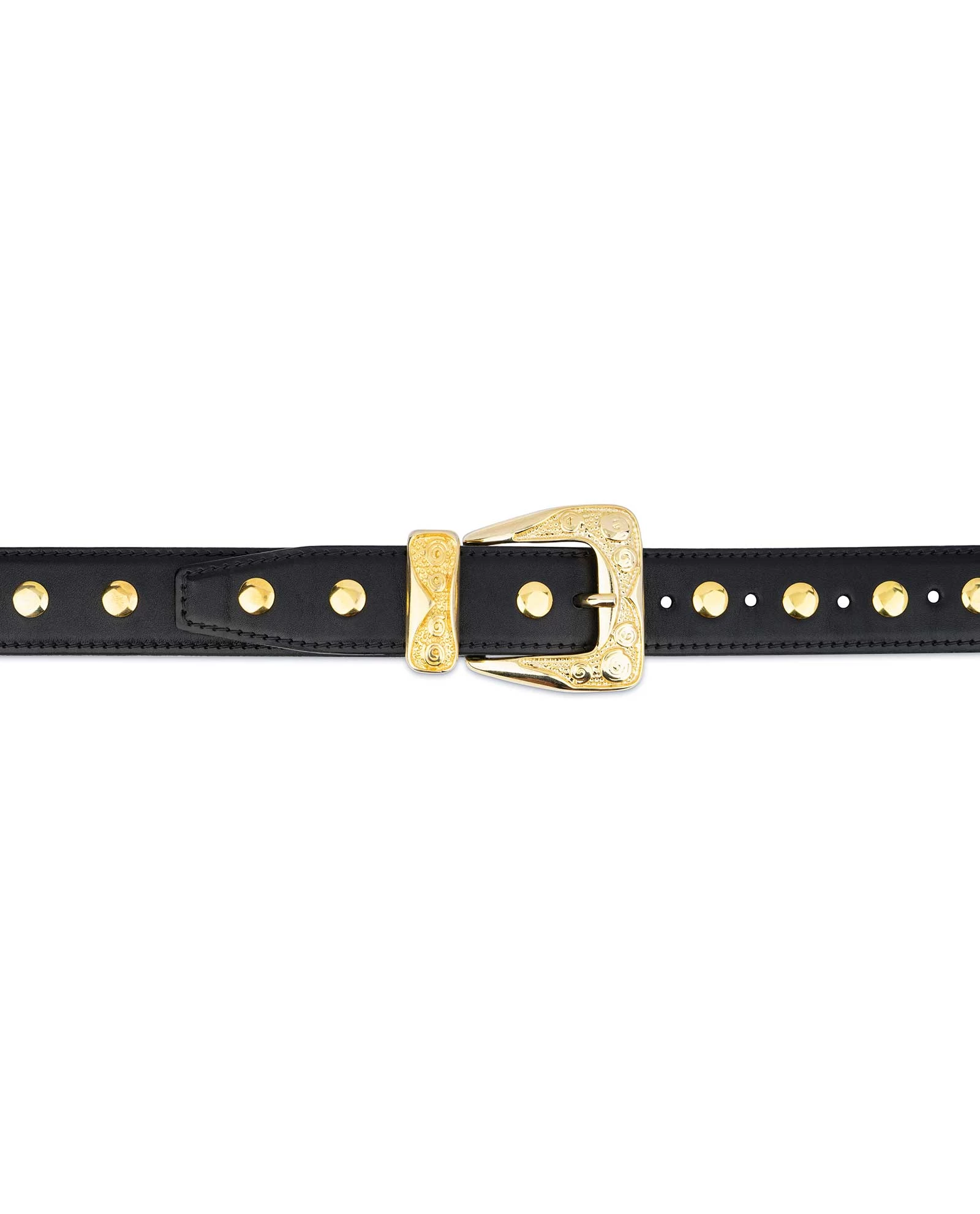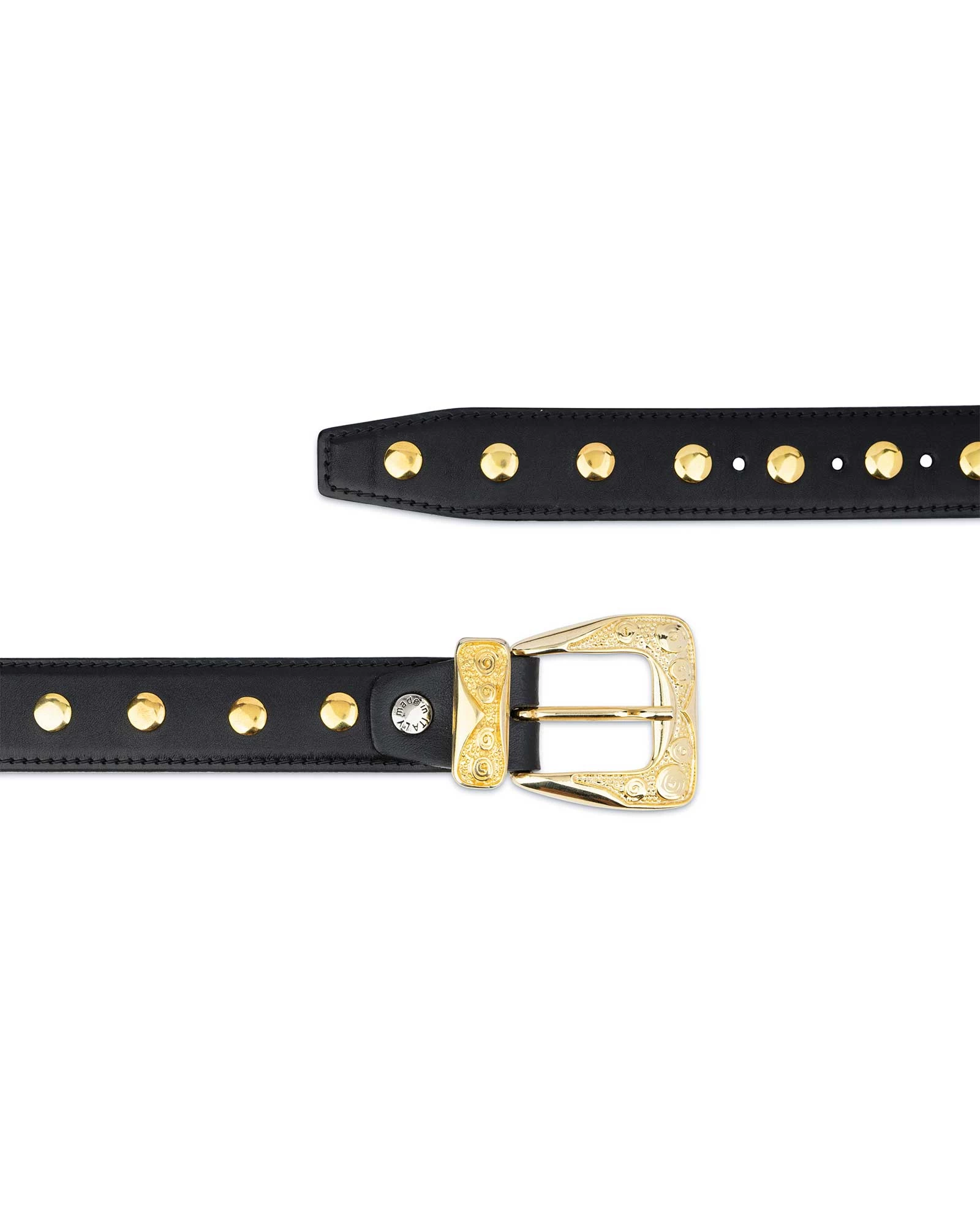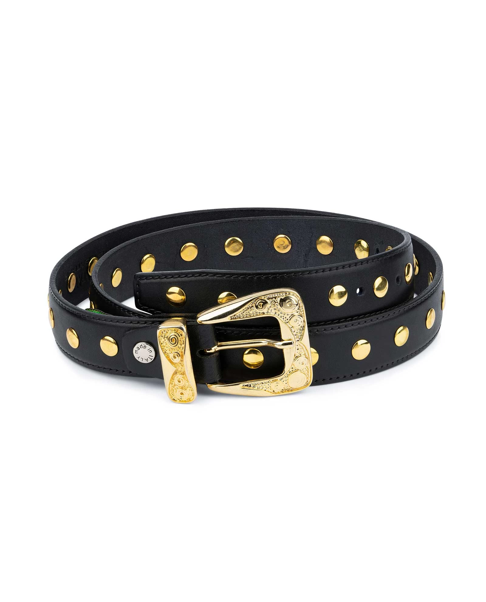 The model is made of full-grain leather featuring tonal stitching for better durability. The women’s belt is available in 1 1/8″ | 3.0 cm wide. The black studded belt is decorated with a gold-patterned Western buckle. Besides, this is a removable type of buckle and you may change to your favorite buckle if necessary. This gold studded belt is available with the quality tag and sold with an elegant black dust bag and a belt authenticity card in the kit. Leather Belt Online store offers customers a huge selection of women’s belts designed by the best European manufacturers. The range of products is so diverse that it is sometimes difficult to make a choice. When choosing a leather accessory, draw attention to the quality of the product.