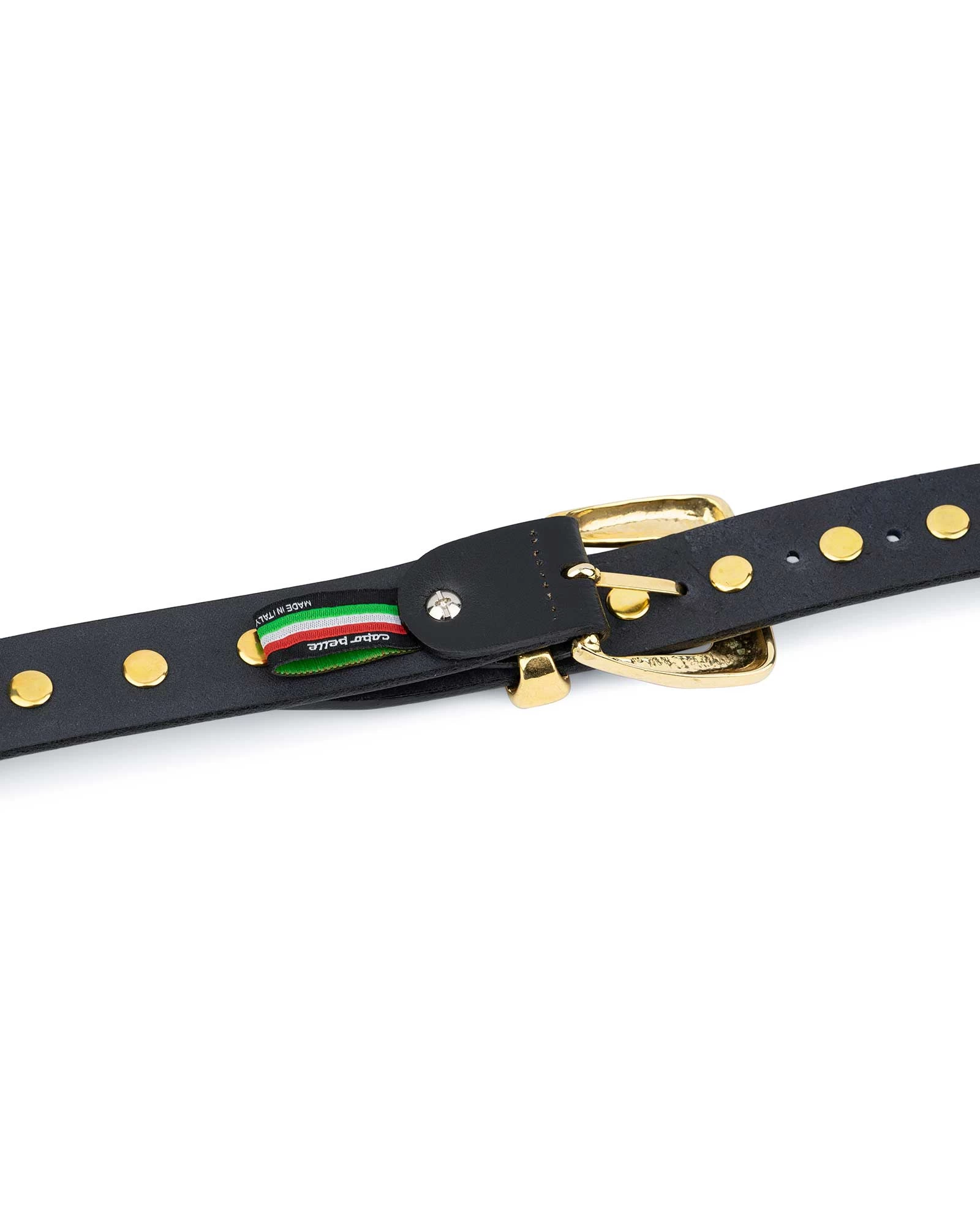 If you are tired of lace and bows, check out a Black Gold Studded Belt in Full Grain Leather by Capo Pelle! Buy a spectacular accessory for brave ladies. This belt with gold color buckle and studs-rivets along the entire length of the belt strap will brighten up everyday outfits and give them a bold note thanks to the gold fittings. A standard-fit leather belt with gold flat studs will transform your wardrobe with its modern design. It’ll be perfect for casual-chic jeans, trousers, skirts, and dresses.