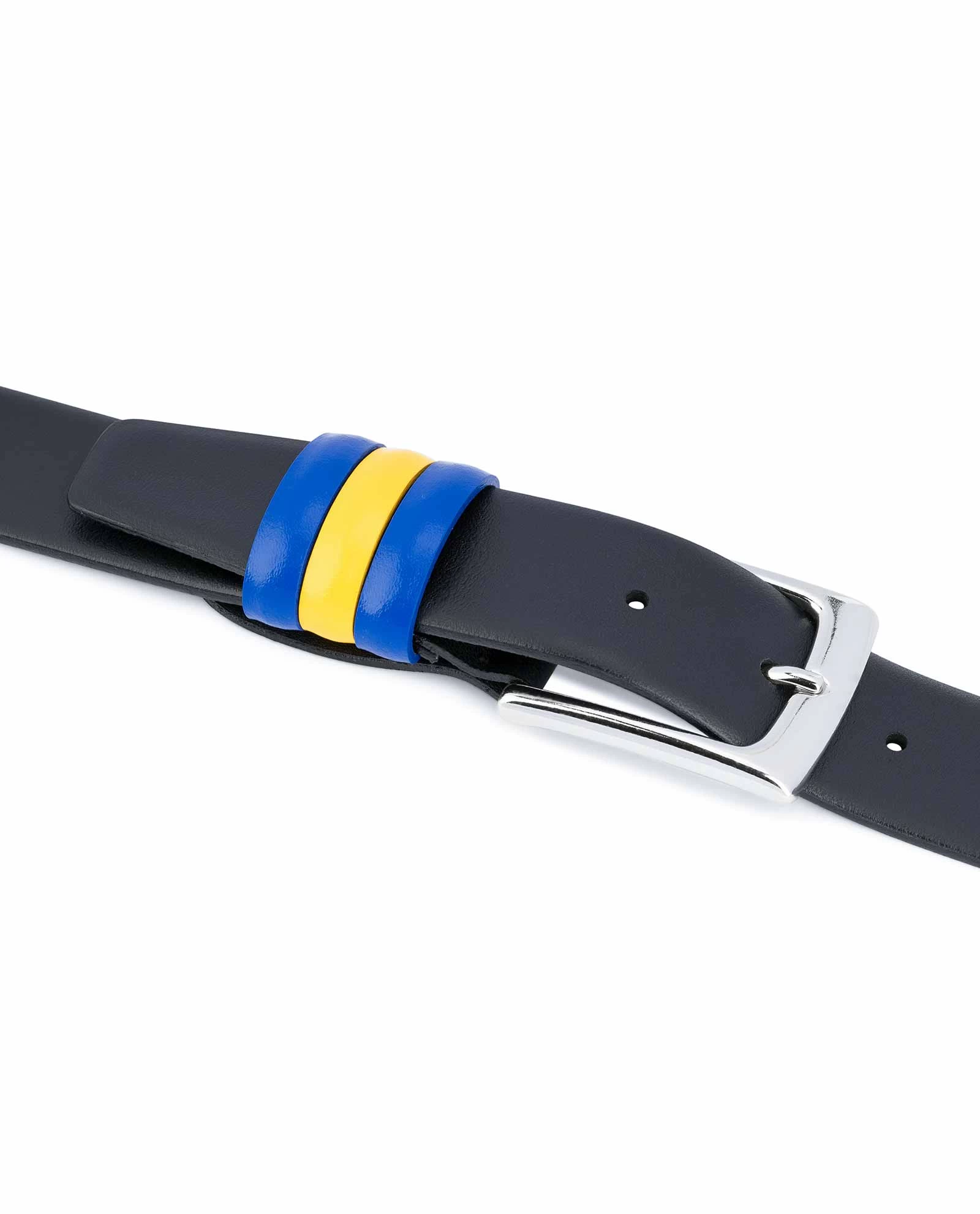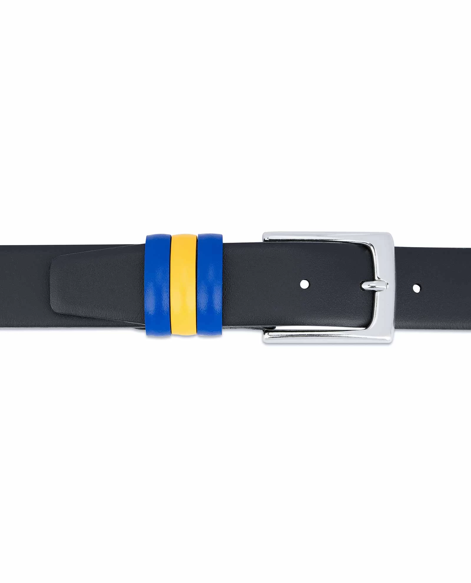 Black leather belt with Sweden flag colors is the high quality item produced by the Italian brand Capo Pelle. The accessory is made of smooth genuine Italian leather and is 1 3/8″ (3.5 cm) wide. The very special detail of this belt is its triple loops of Swedish flag colors. Such an accessory will be an amazing present for those who have strong patriotic feelings or simply love Swedish culture.