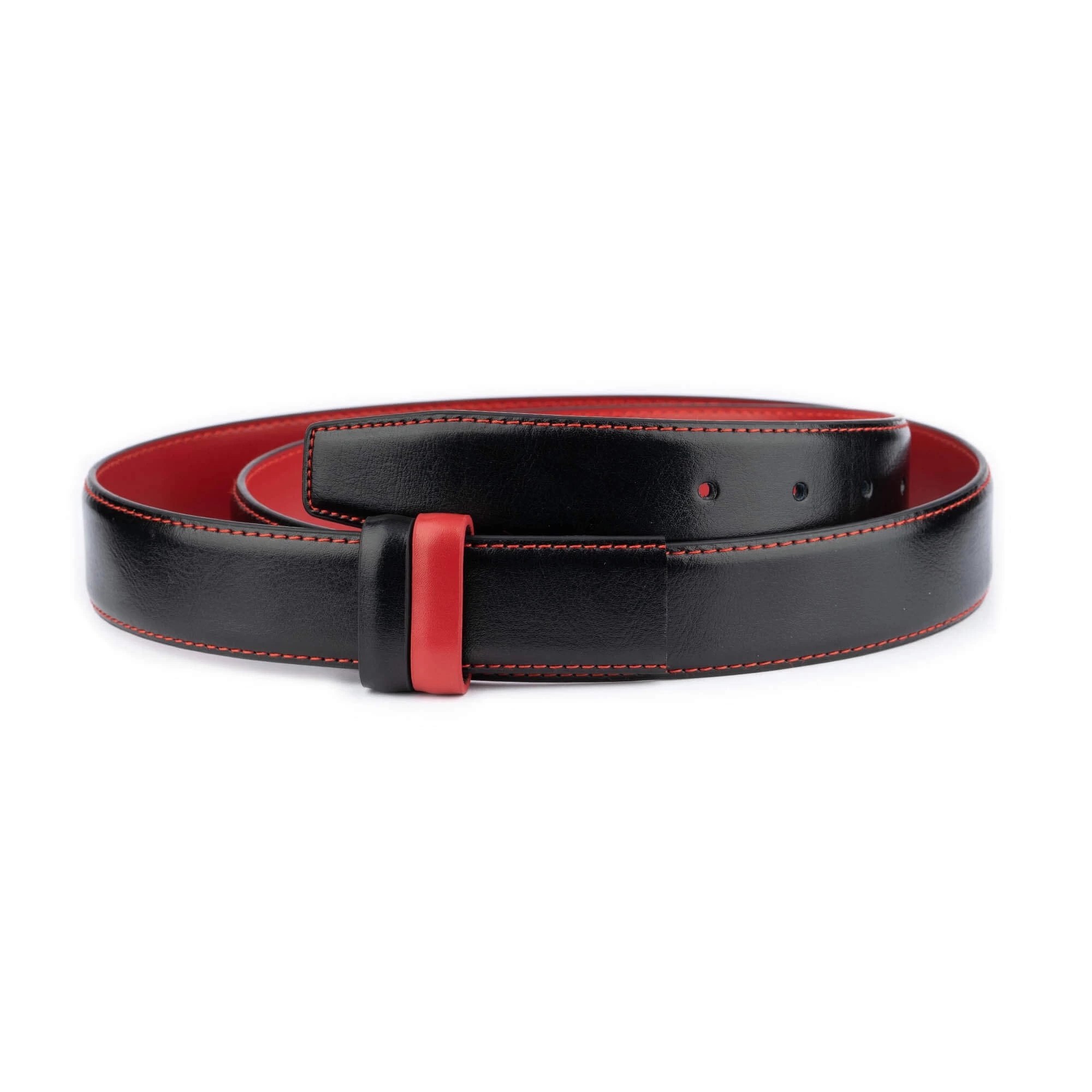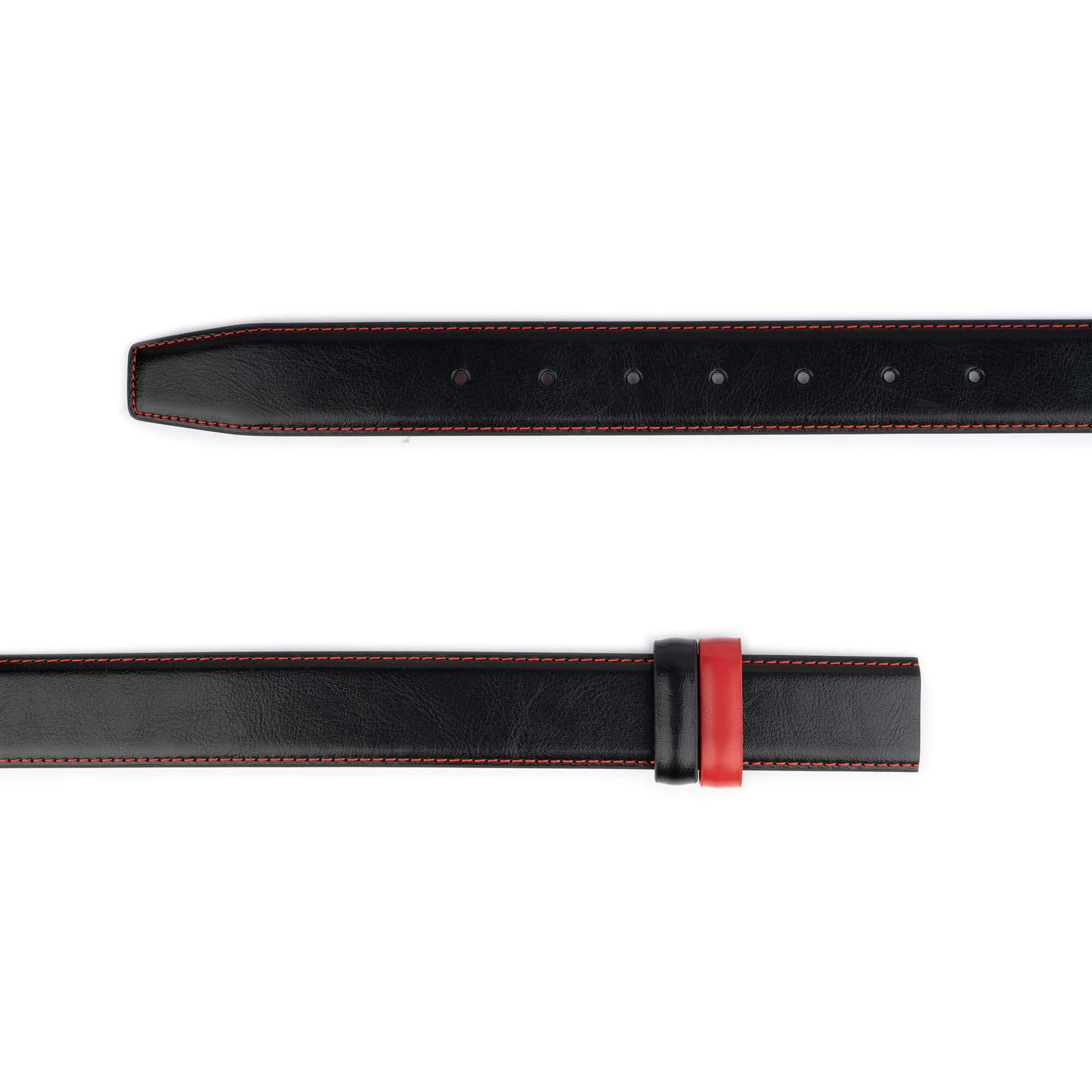 Buy Black Leather Strap For Belt Red Stitching at LeatherBeltsOnline.com – 1 3/8″ (3.5 cm) wide – Black color – Genuine leather – No buckle – Model code REDSTI35BLACUT