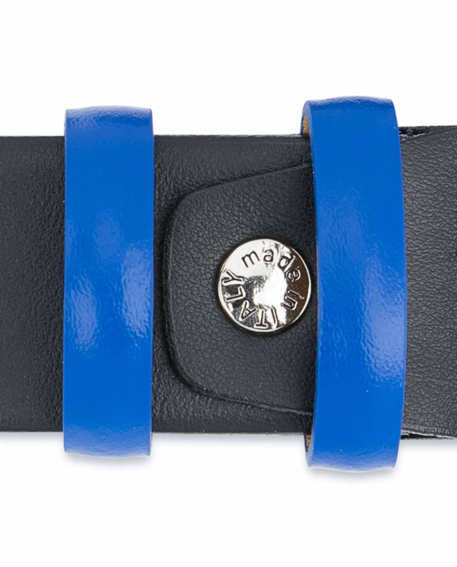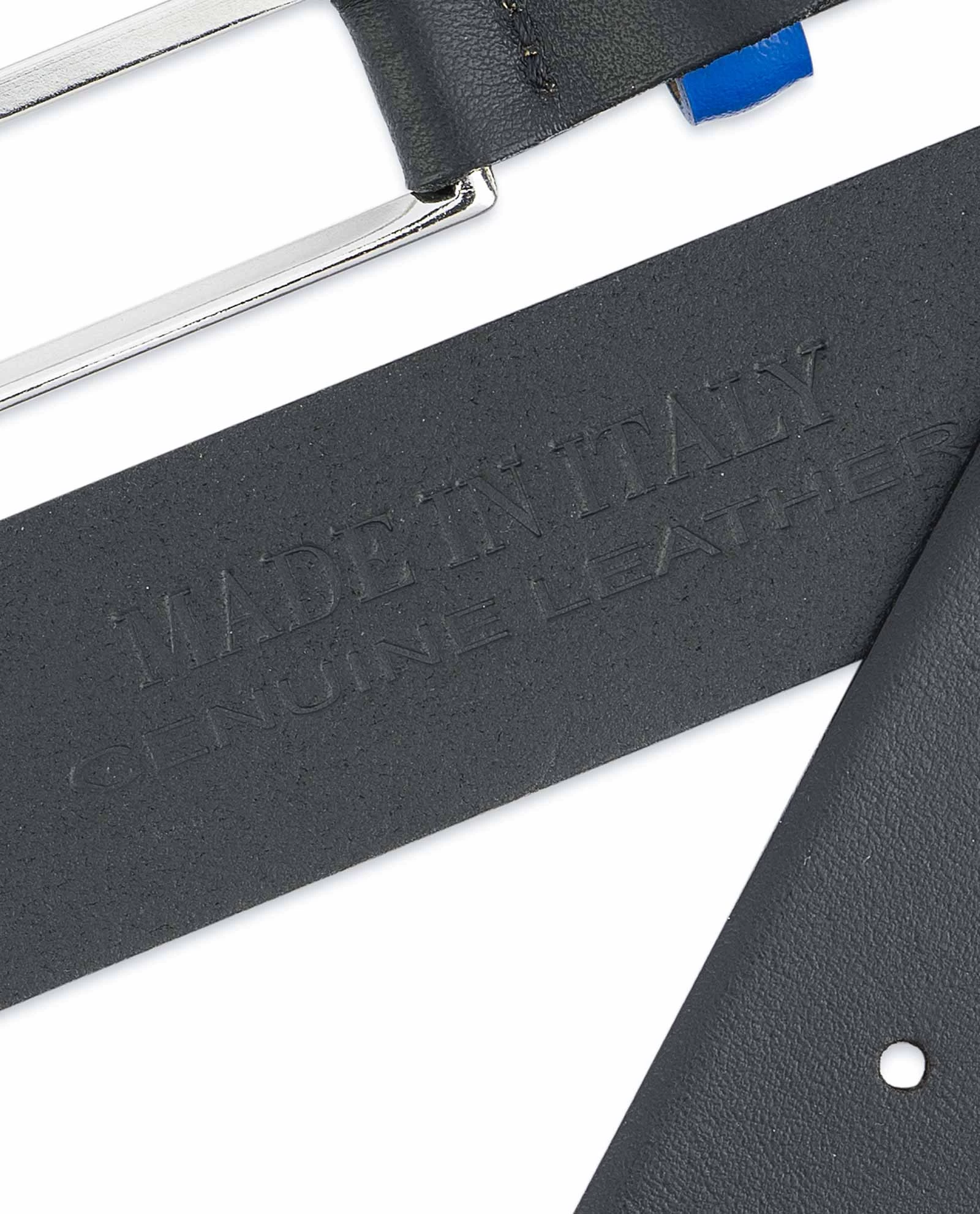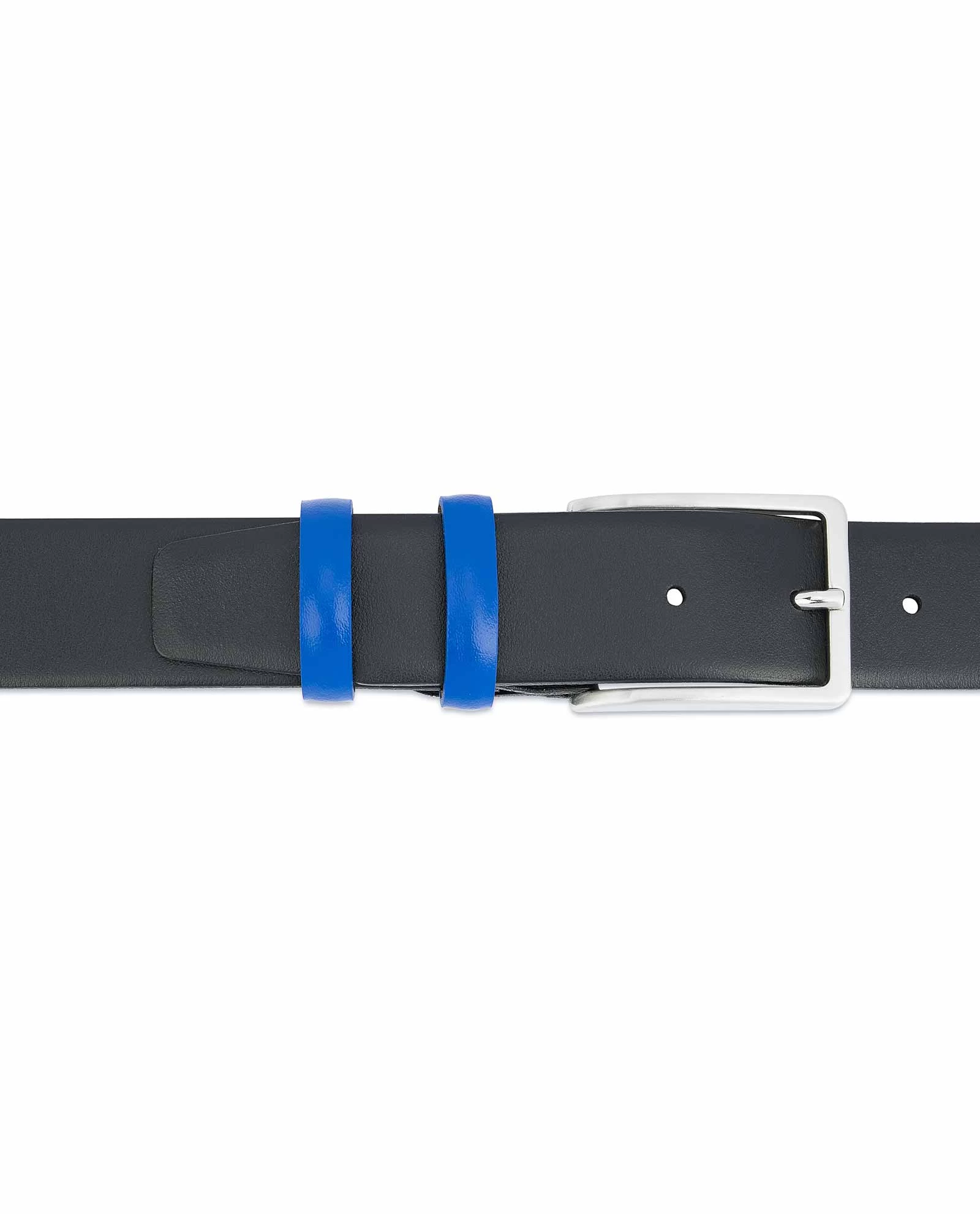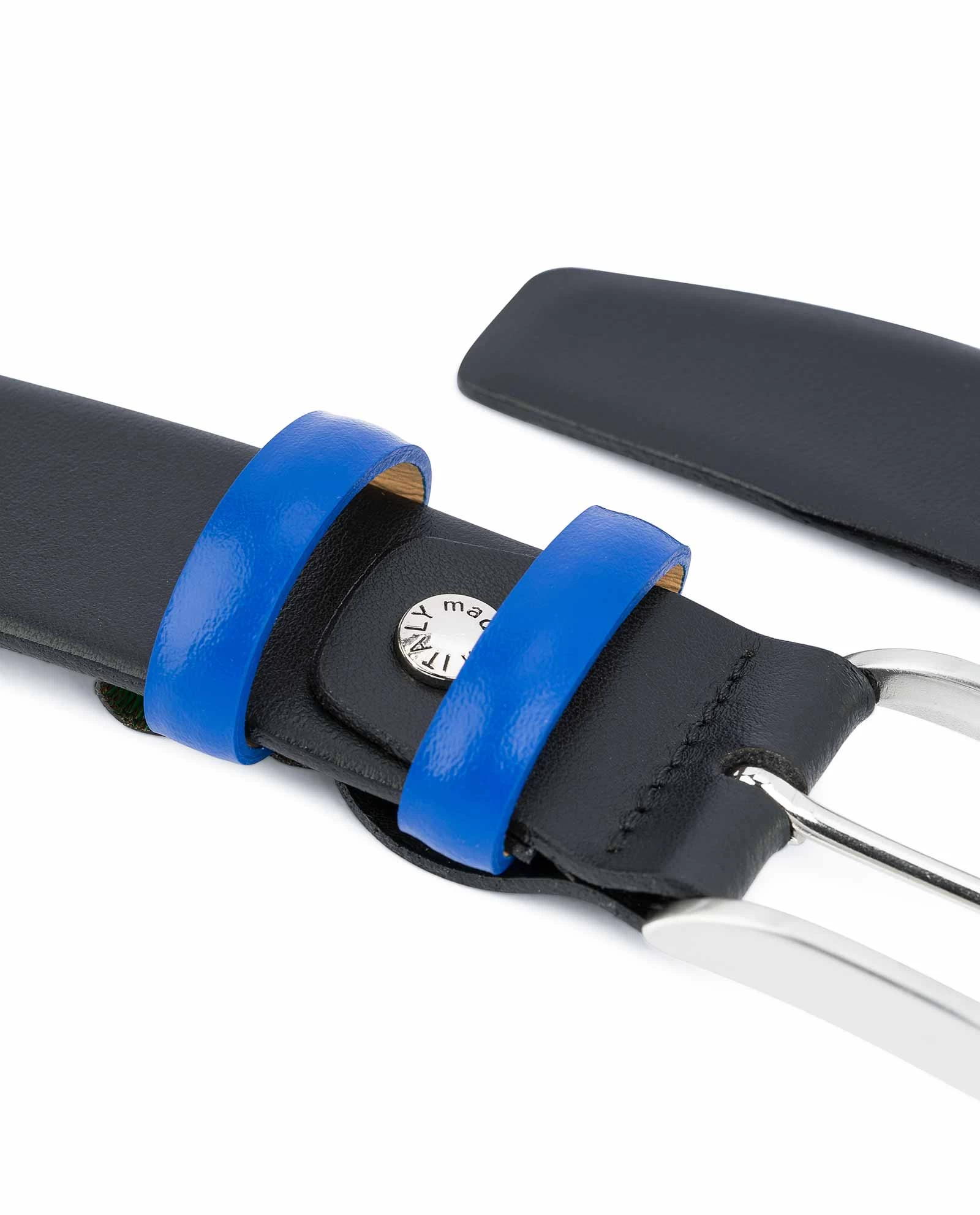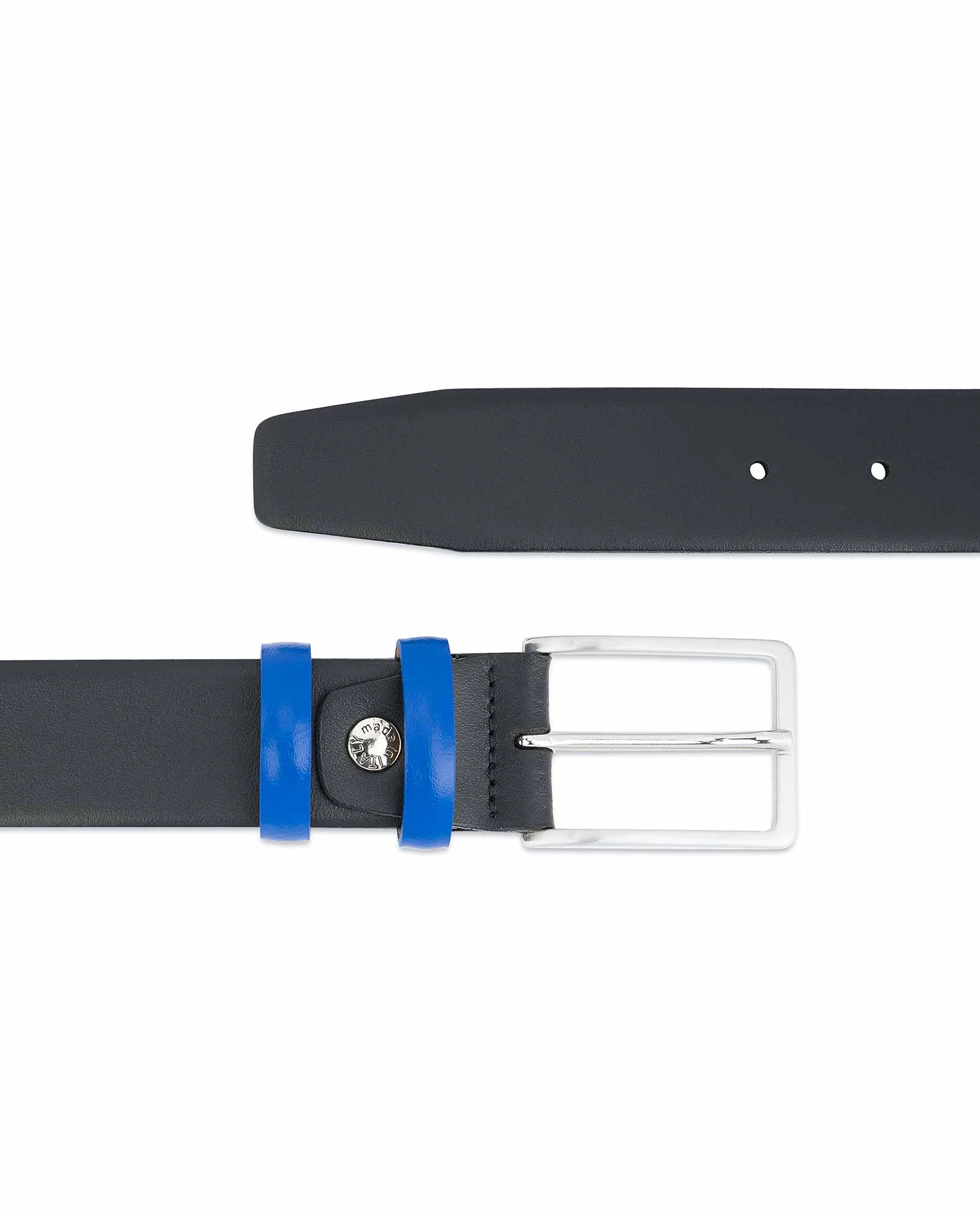 Black men’s belt with blue leather loops by the famous Capo Pelle brand has a distinctive style with and the height of 1 3/8″ (3.5 cm). The belt was designed and produced in Italy, it’s made of real smooth leather. The accessory outstands in the row of casual men’s leather belts by its trendy, unusual look – rich black color with a blue leather loops.