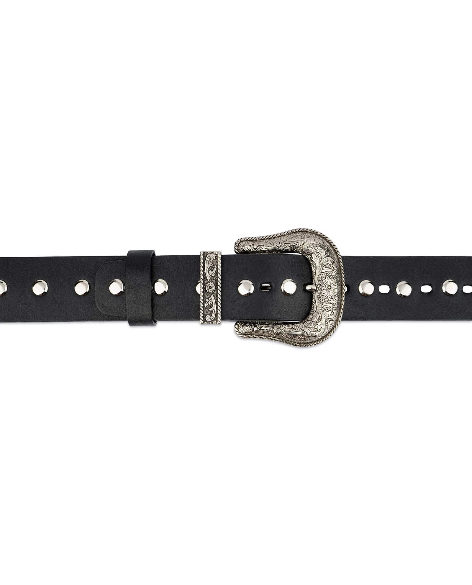 This original full-grain leather men’s belt also has its peculiarities. It is made of 100% genuine leather dyed in black color and adorned with silver color cowboy buckle and round rivets. The belt is quite thick, 1 1/2″ | 4.0 cm in width, and easily passes through the jeans loops. The material is hard, durable, and reliable. Such a product is unlikely to be damaged or ripped over time. The belt hardware is made of solid metal. The buckle and one loop are florally patterned and designed in Western-style, the essential feature of casual belts. Besides, this is a removable buckle and can be replaced with your favorite one. You may buy a classic or another removable buckle on our site, and swap out the buckle by yourself at home using a screwdriver or at a leather repair service. A wide variety of replacement options of belt loops, buckles, and Chicago screws are for your choice too.