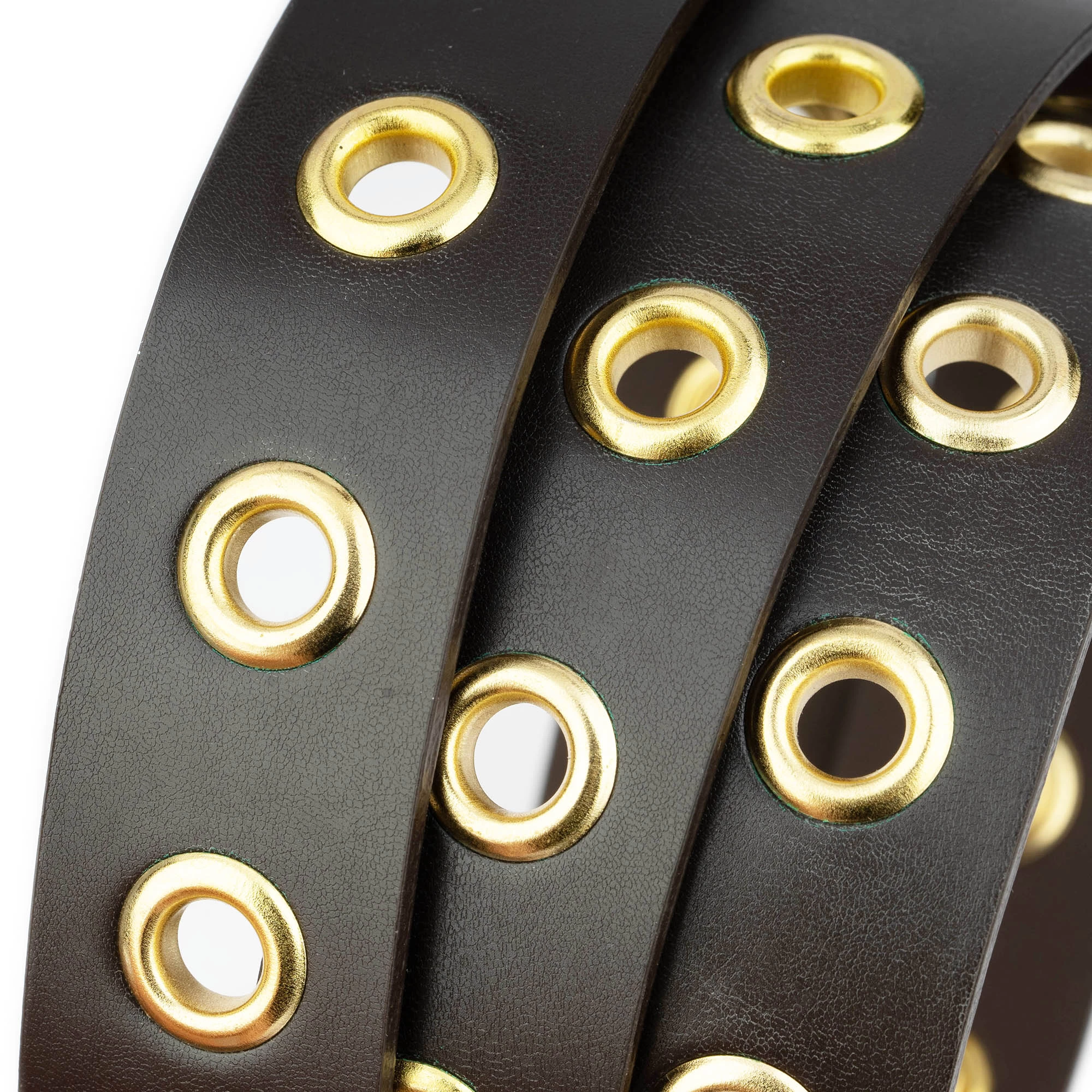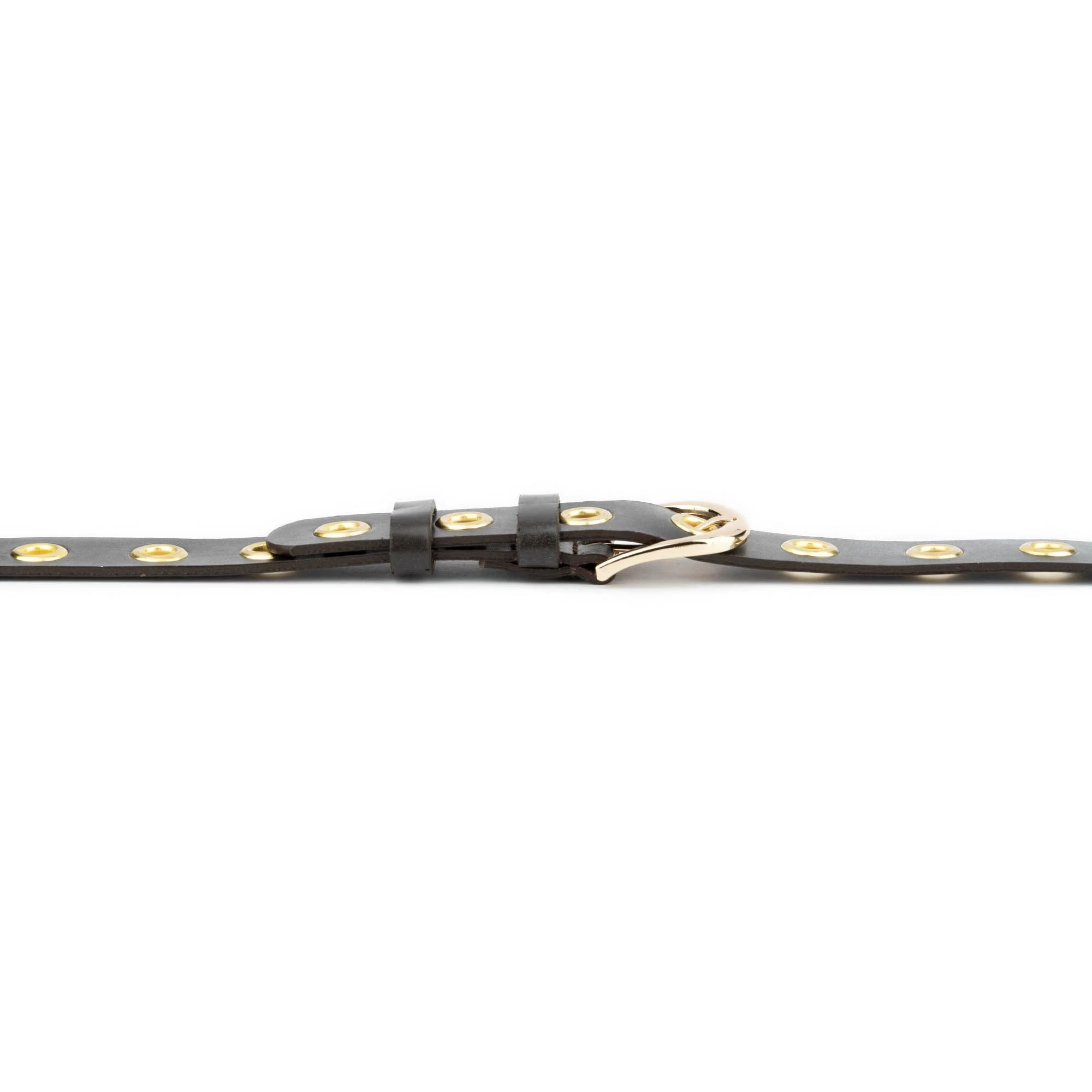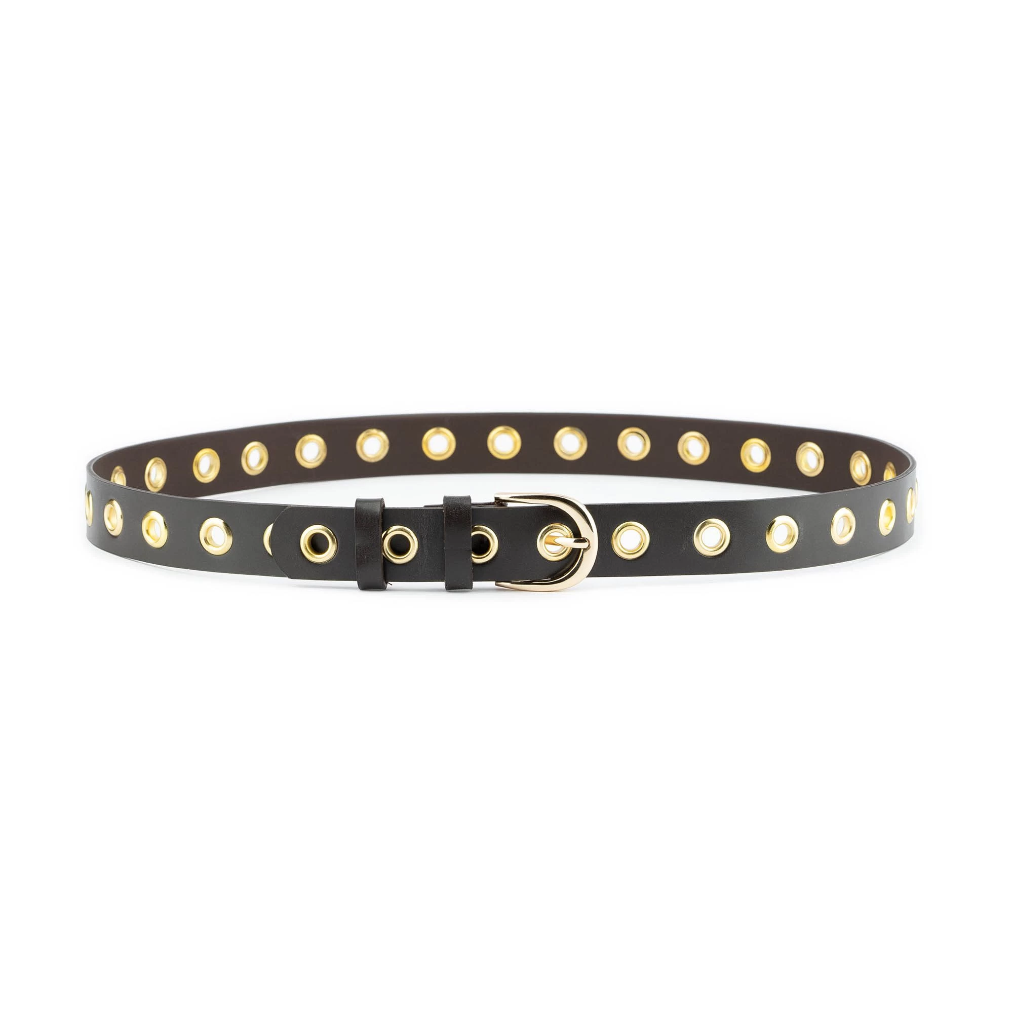 Buy Brown Leather Gold Eyelet Belt at LeatherBeltsOnline.com – 1 1/8″ (3.0 cm) wide – Black color – Genuine leather – Gold color buckle and gold studs – Model code EYEGOL30BROWEL