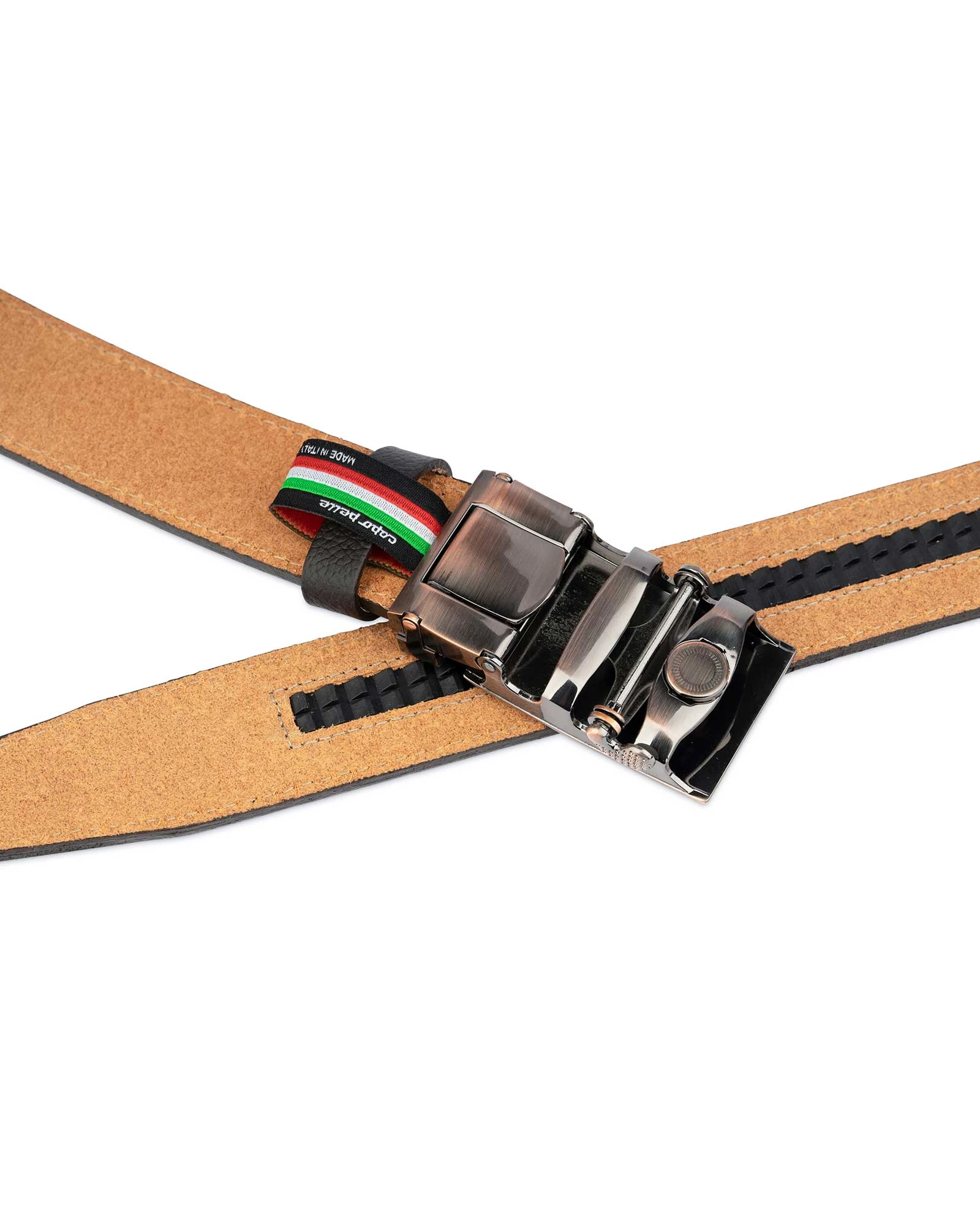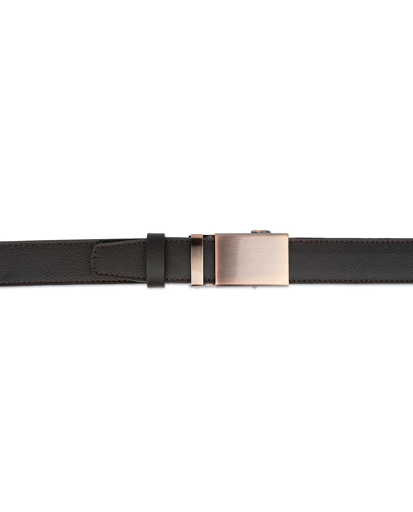 This is a ratchet belt. A ratchet mechanism is usually used in a belt without holes and very convenient for fastening the belt. You can relax the belt at any time to a perfectly suitable size fit for you. The copper color buckle is coated with a matte lacquer finish. Some scuffs give the buckle an antique look. This polished buckle plate looks noble. The canvas is made of genuine Italian leather. It is pebbled leather dyed in dark brown color. The durable canvas is reinforced with cooper color threads that guarantee frequent and extensive use of the item. An elegant black dust bag, a belt authenticity card, and a paper tag go with the kit. By choosing a belt, pay attention to the belt dimensions. The length and the width of this belt are pointed in the size guide. If the belt doesn’t meet your current standards or size, please, check out other models from Capo Pelle in our online catalog.