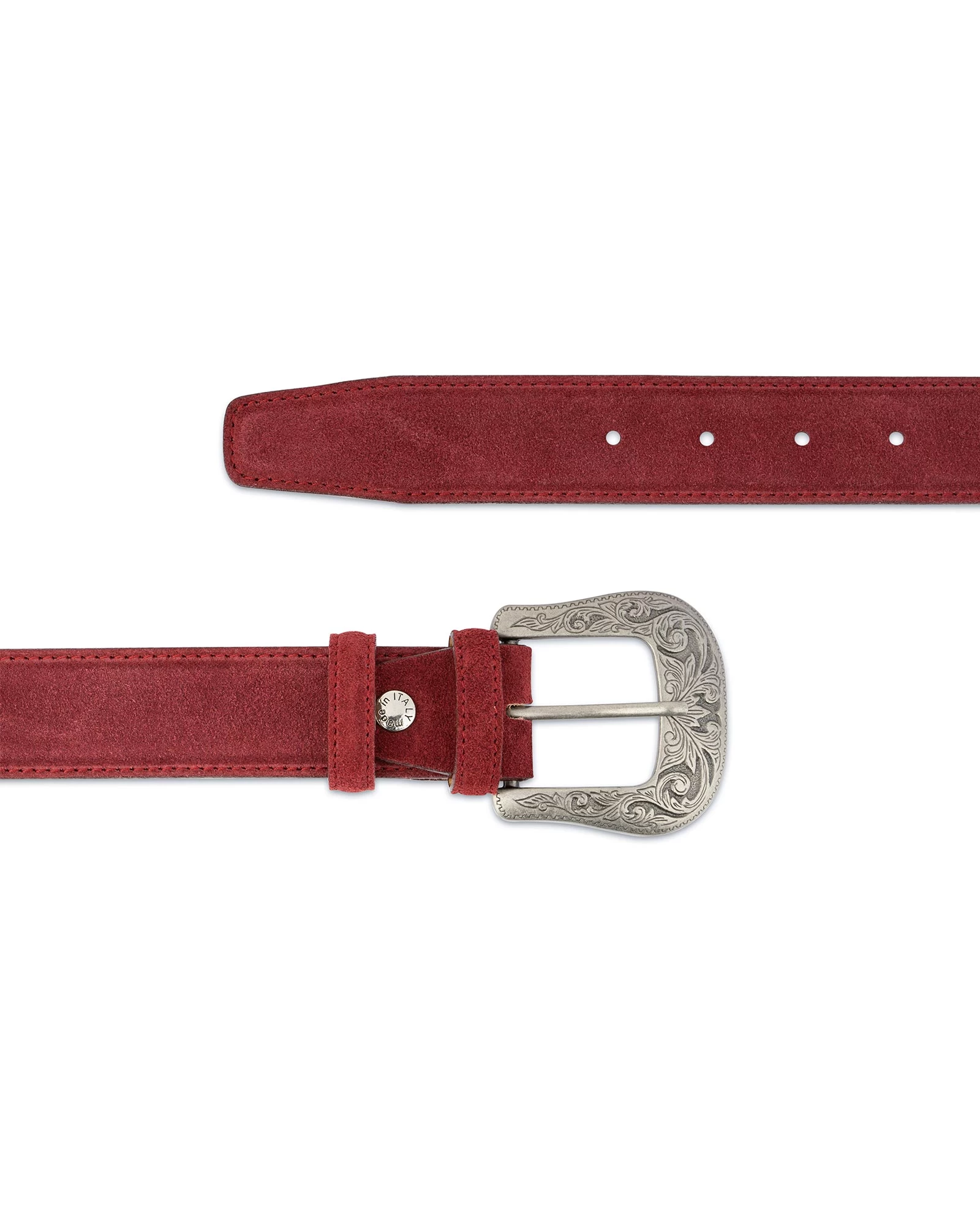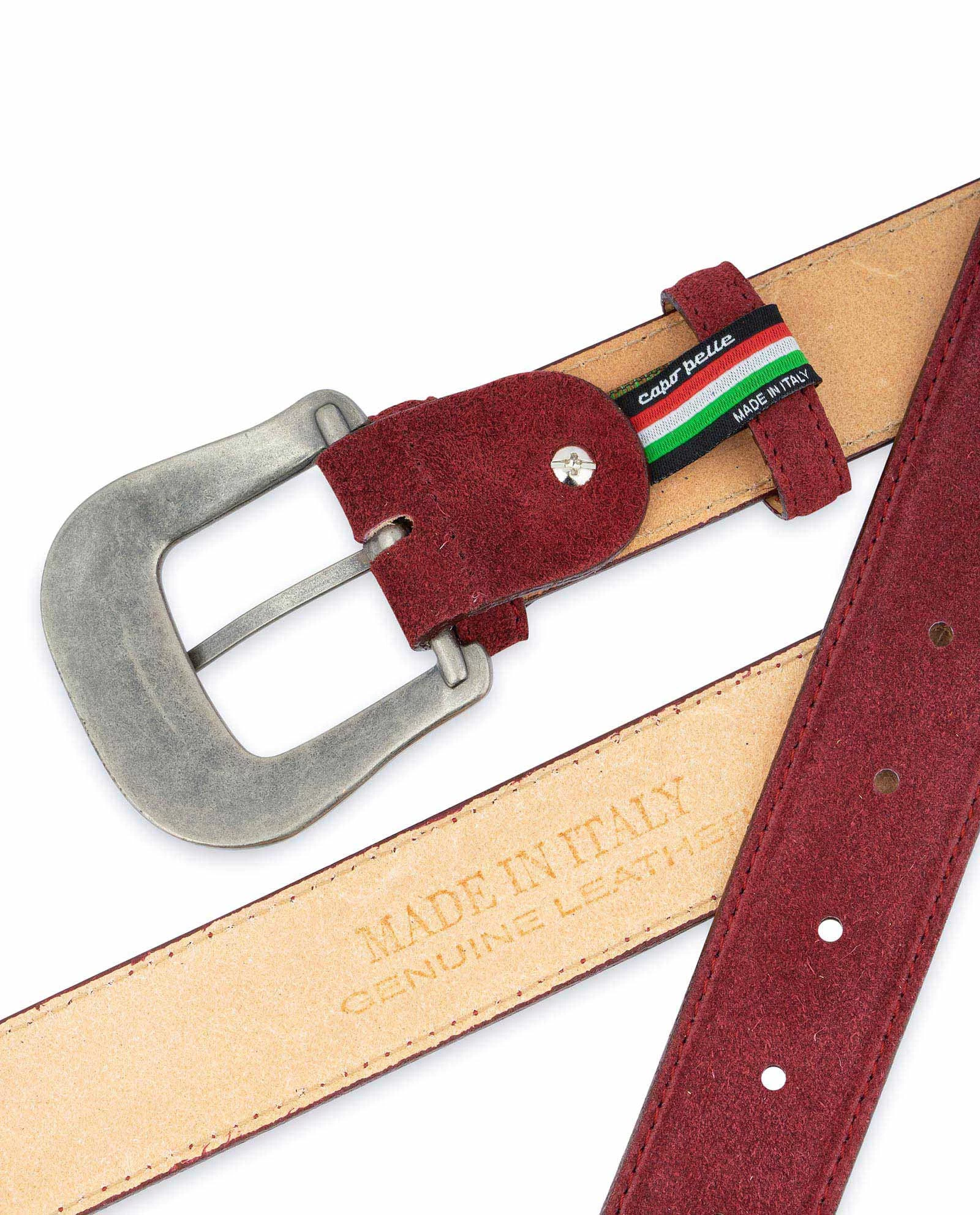 Burgundy menβs suede belt with western buckle by Capo Pelle brand is made in Italy of genuine suede leather. This menβs beltβs height is 1 3/8β³ (3.5 cm ). This menβs belt was made with outstanding quality β it has a nice soft texture with a pleasant touch.