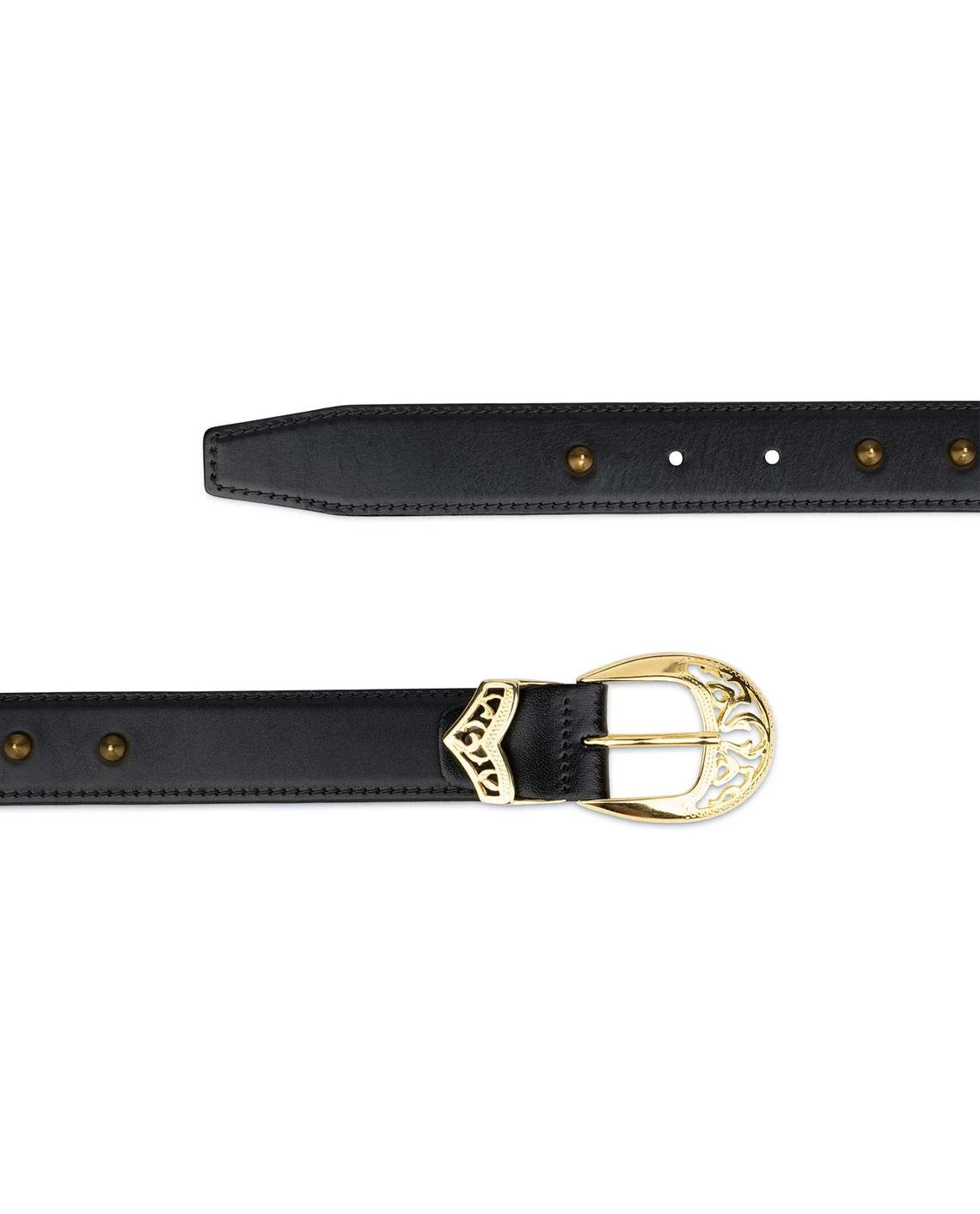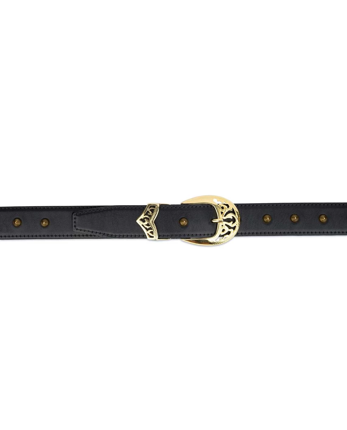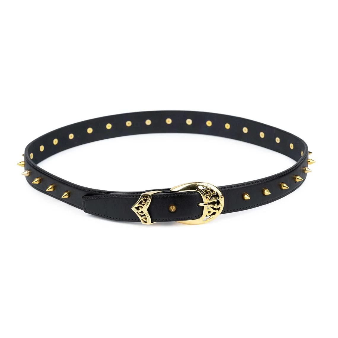 The item is even more beautiful in real life than its image. The women’s black studded belt is made of genuine Italian leather with stitching along the entire length of the product, which makes the belt complete and sophisticated. The piece is embellished with solid metal hardware of a gold-tone. The cones studs go the full length of the leather strap that look so much better than pyramid studs, while the filigree buckle and single keeper finish the belt. The genuine leather belt can be worn as a hip belt or at the waist, depending on your preference.