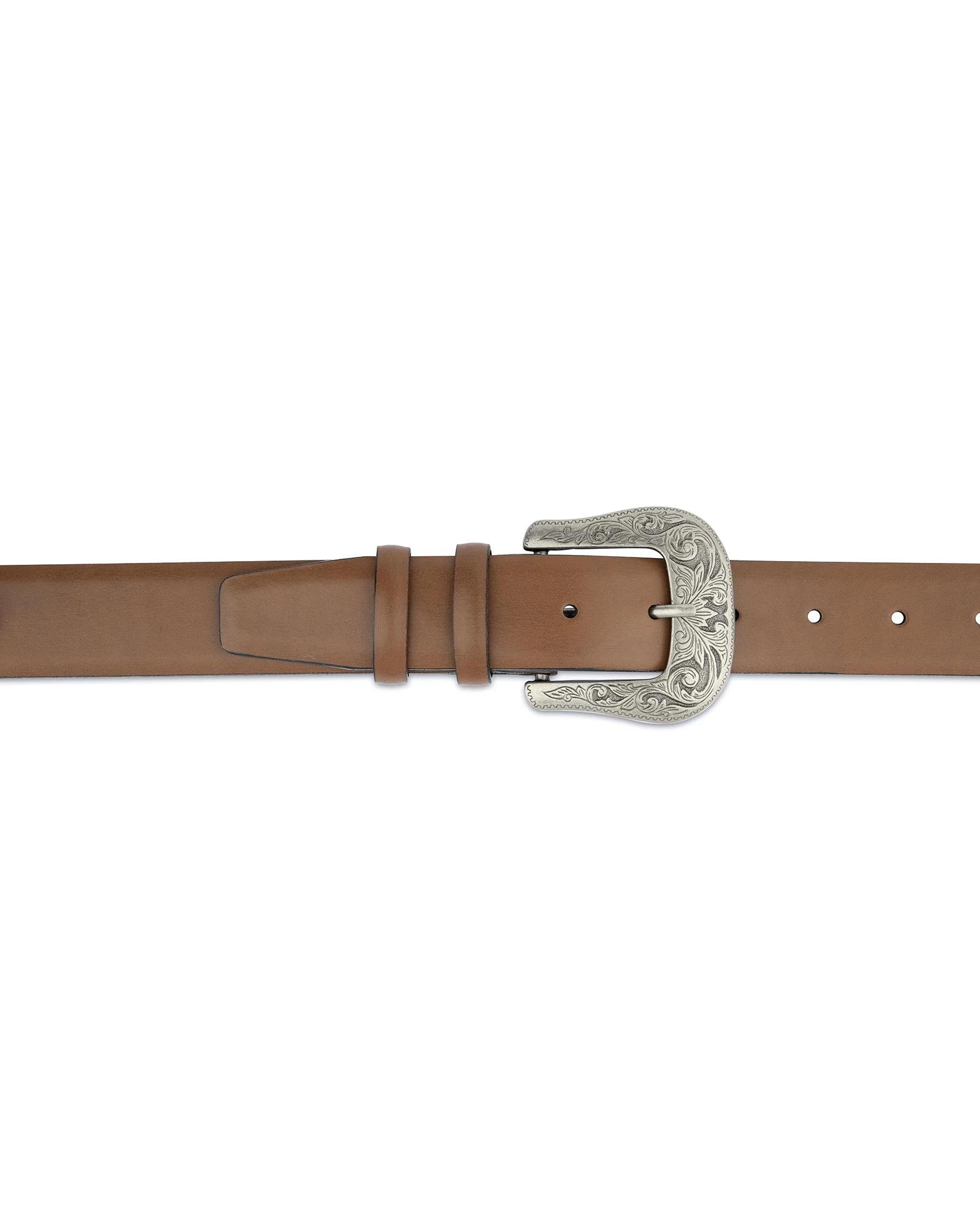Men’s brown western belt by the famous Capo Pelle brand has a truly distinctive, noticable western style, with a height of 1 3/8″ (3.5 cm). This men’s leather belt is produced in Italy and made of genuine veg tan leather. The accessory outstands by its fashionable, trendy look – rich brown color, black on the back side. The texture is smooth; the leather is soft but durable.
