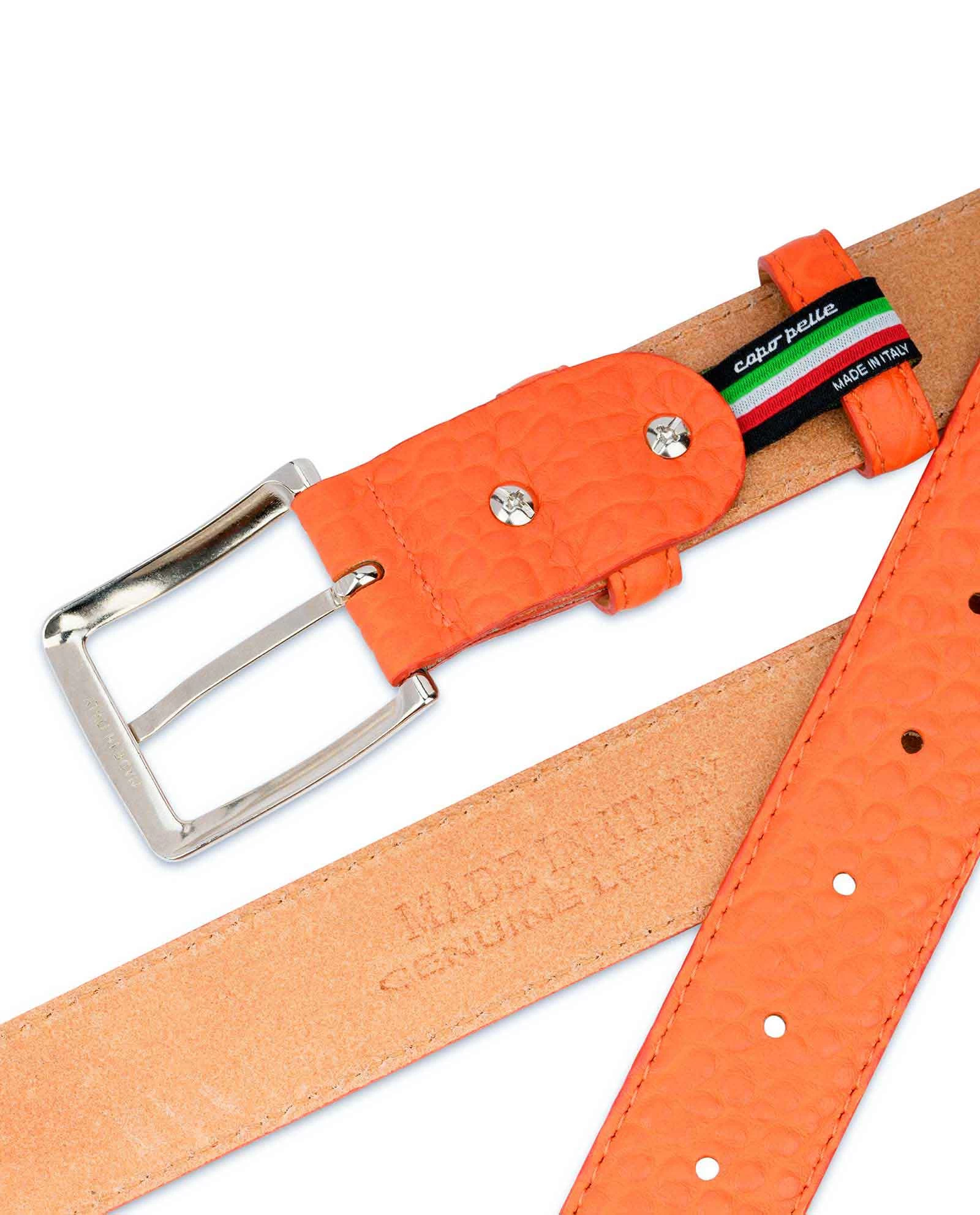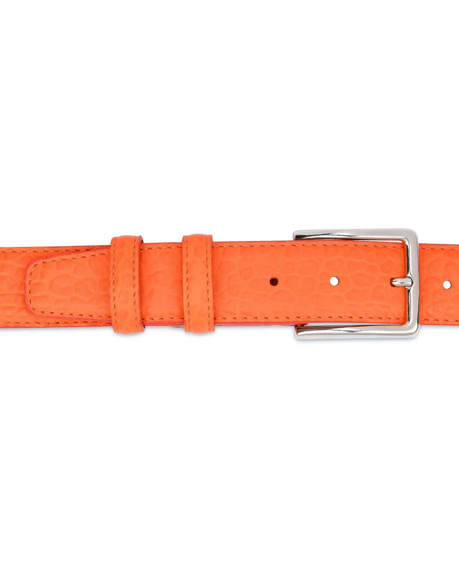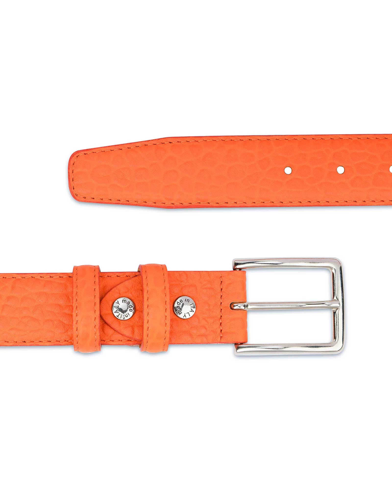 Men’s orange leather belt by the Capo Pelle brand is made of genuine Italian pebbled leather. The accessory is 1 3/8″ (3.5 cm) wide. The item is quite distinct by its top-notch quality and bright orange color, the unique elegant texture has a pleasant touch, the leather is durable and soft.
