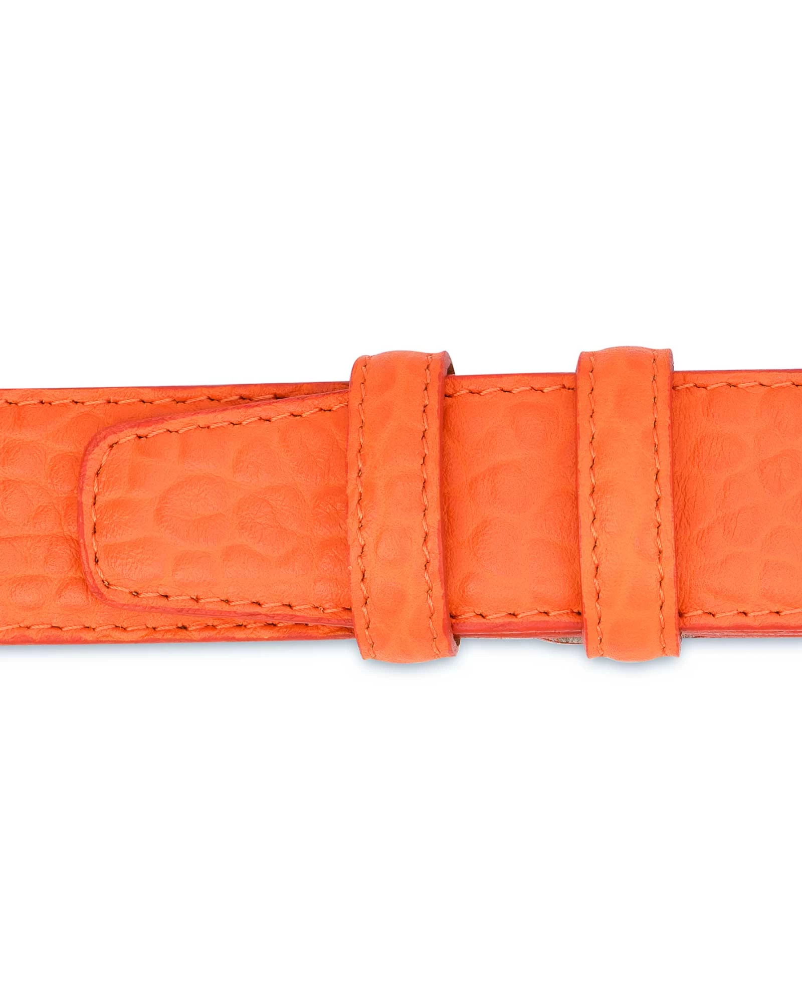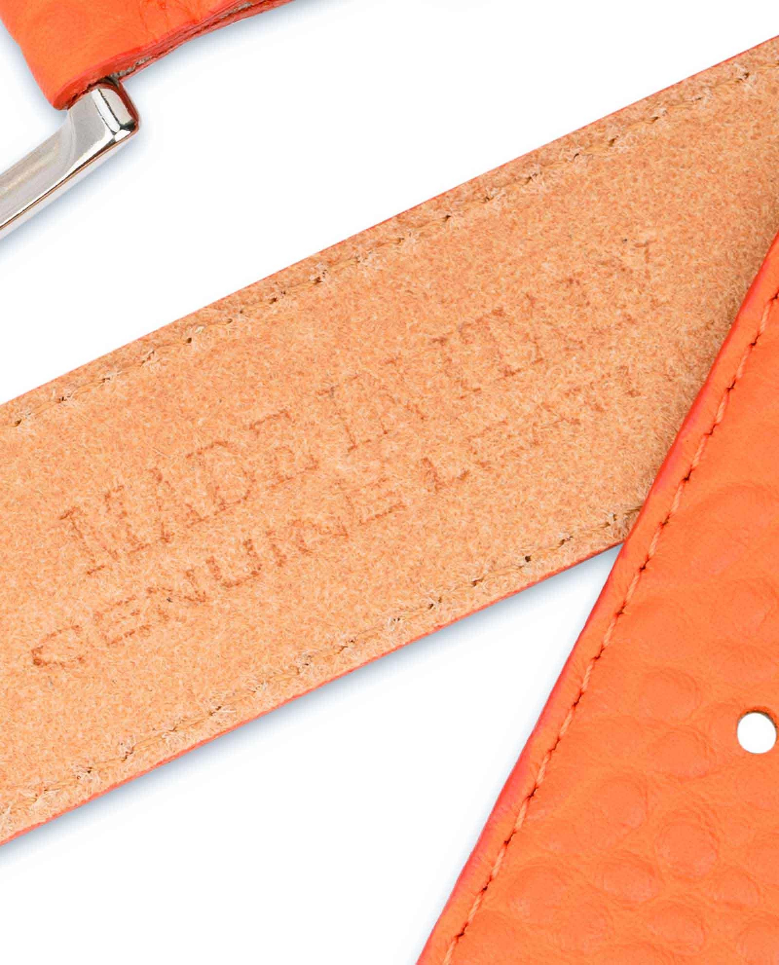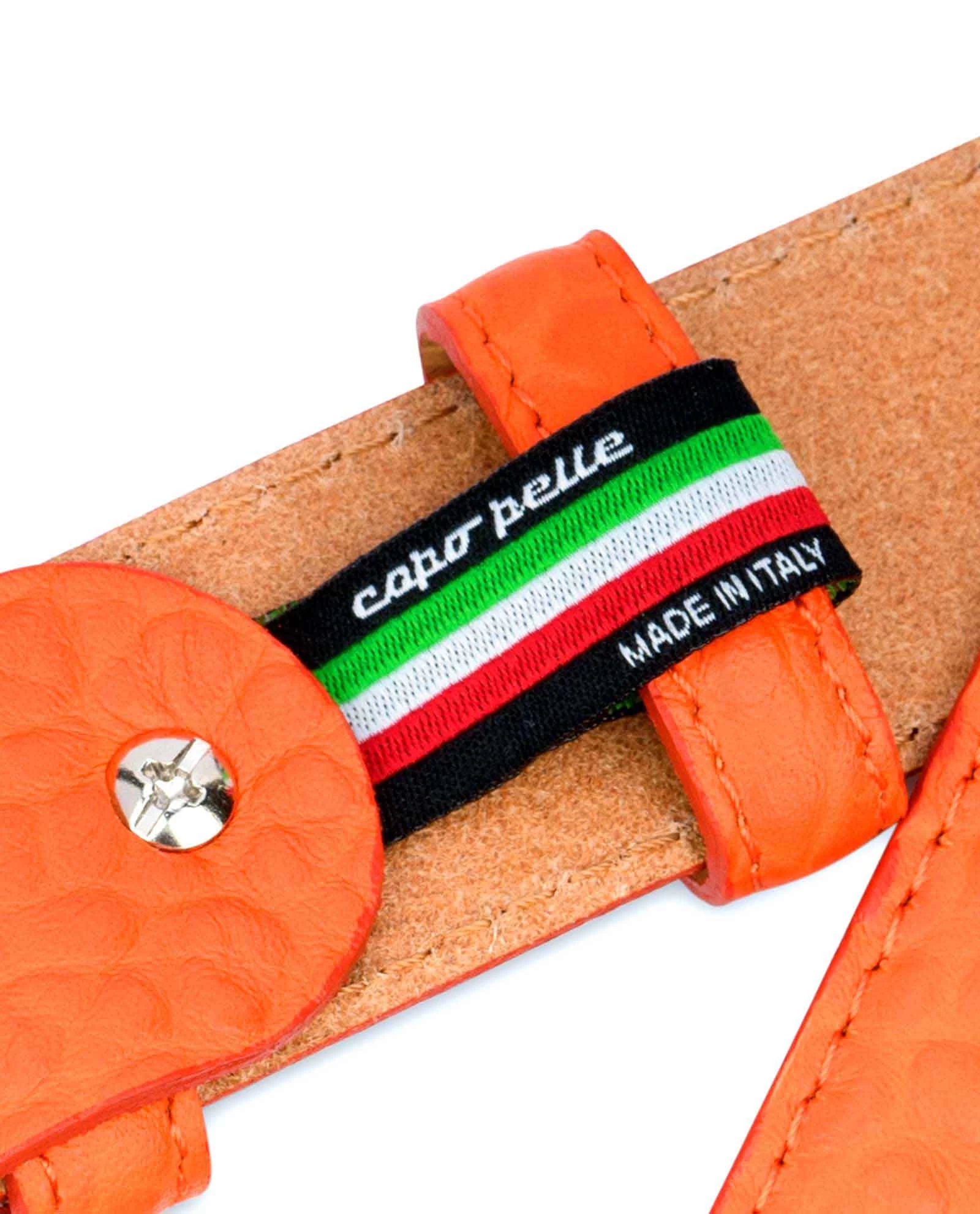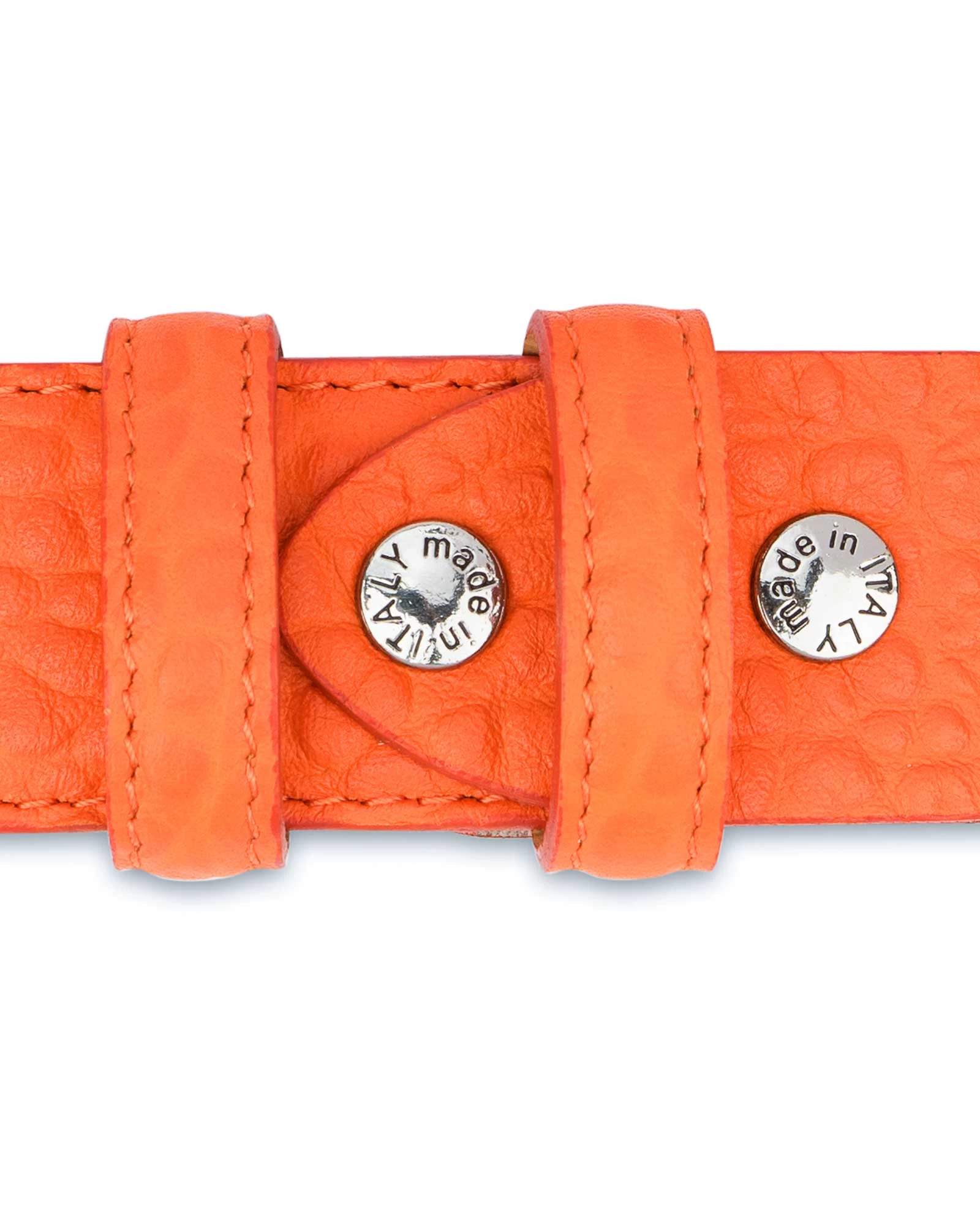 Men’s orange leather belt by the Capo Pelle brand is made of genuine Italian pebbled leather. The accessory is 1 3/8″ (3.5 cm) wide. The item is quite distinct by its top-notch quality and bright orange color, the unique elegant texture has a pleasant touch, the leather is durable and soft.