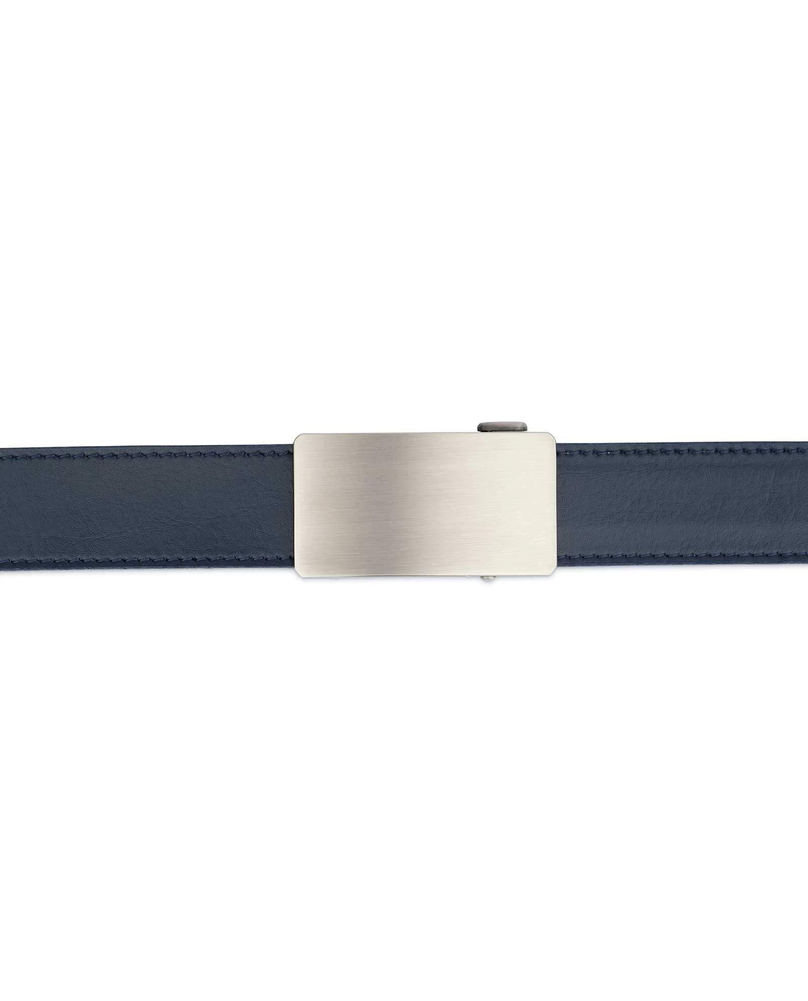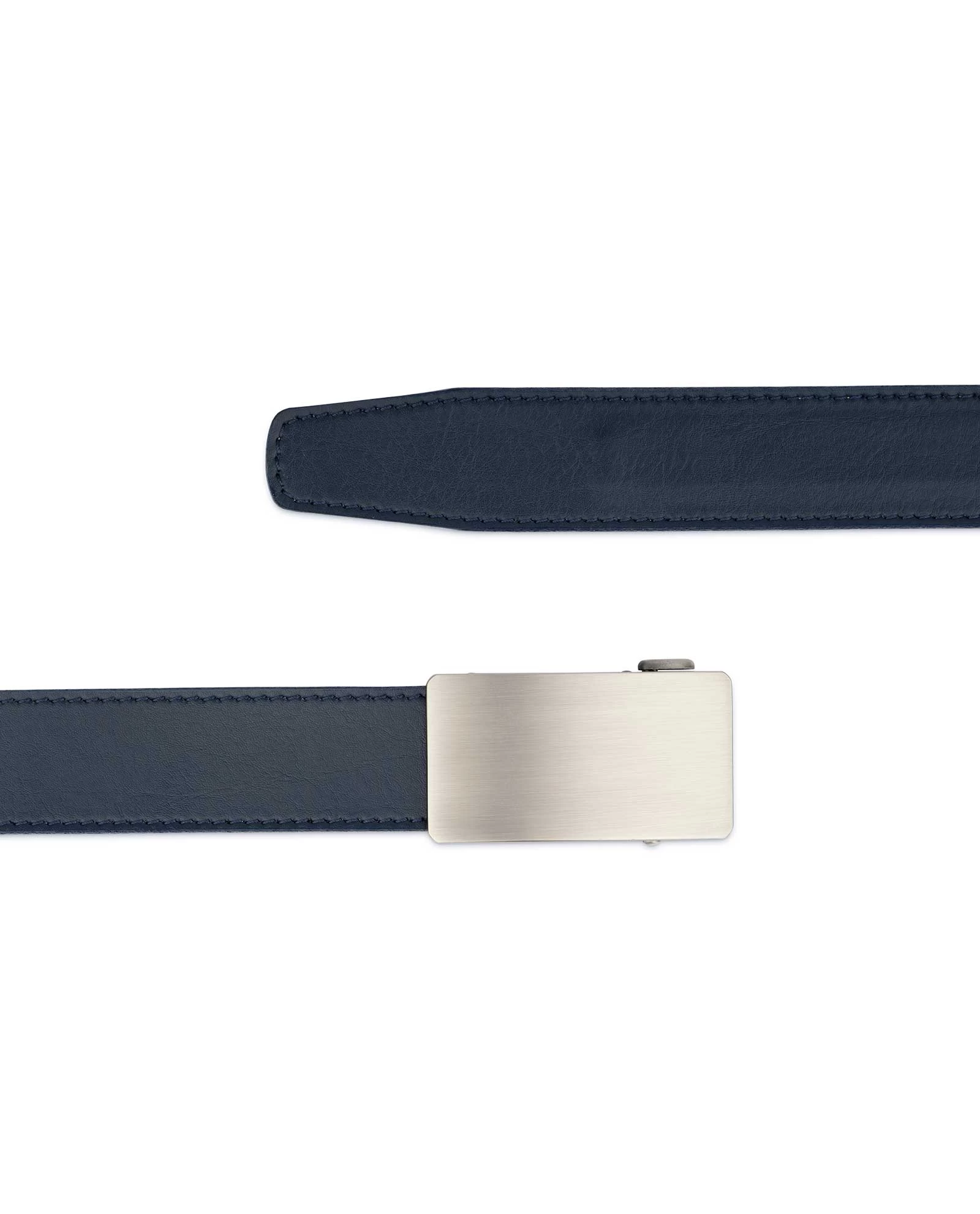LeatherBeltsOnline.com offers customers a novelty from the Capo Pelle brand – a trendy Mens Blue Comfort Click Belt with a silver matte finish buckle. This is an upgraded release of the navy belt, well reinforced with durable dark blue threads and rounded end. For those who are searching for a ratchet belt for their favorite jeans, then this accessory is a win-win. This is a belt with a smooth texture, no patterns or embossing. It is made of genuine Italian leather. The dark blue canvas is firmly stitched with threads for better durability. The gray color buckle is polished and coated with a matte lacquer finish.