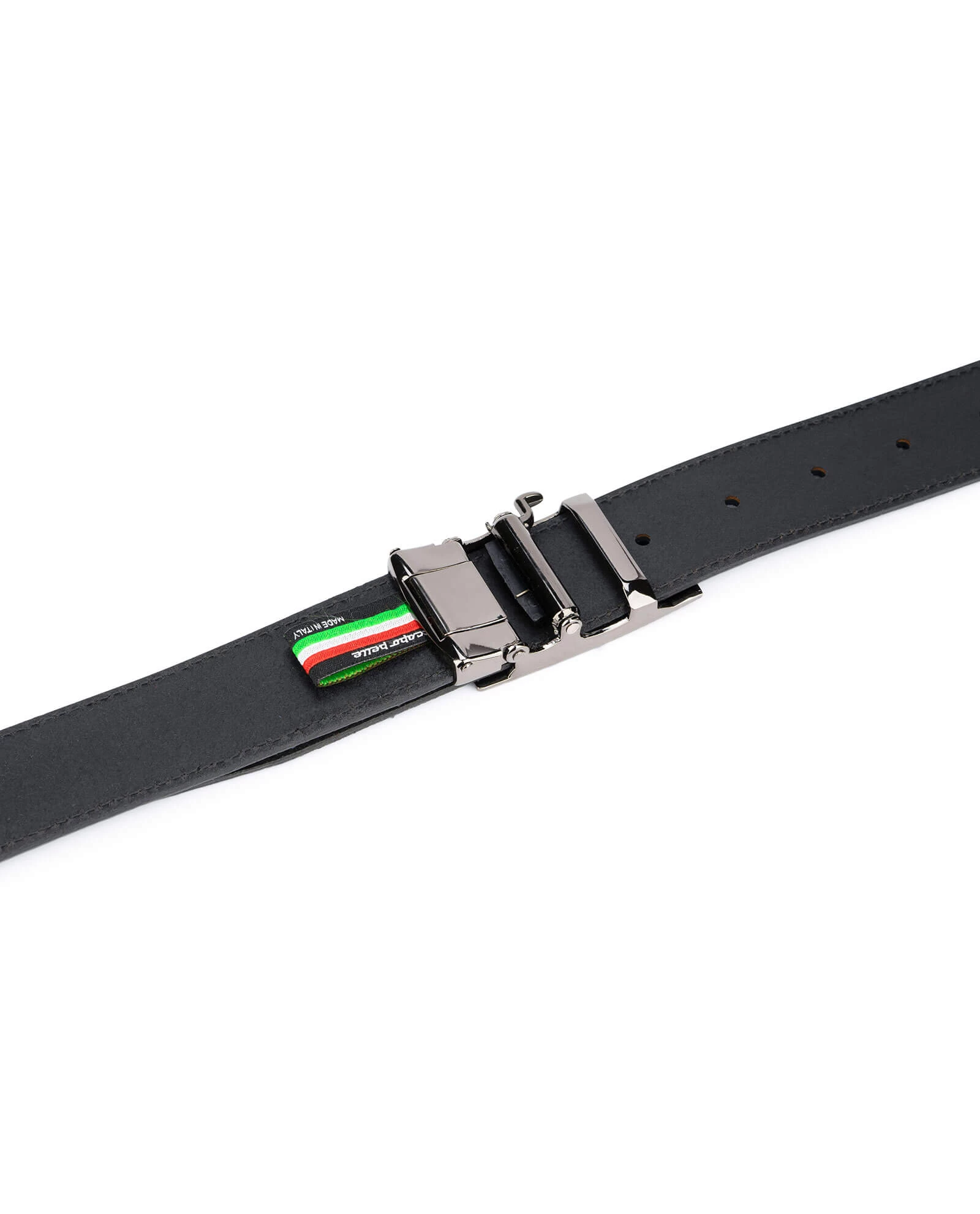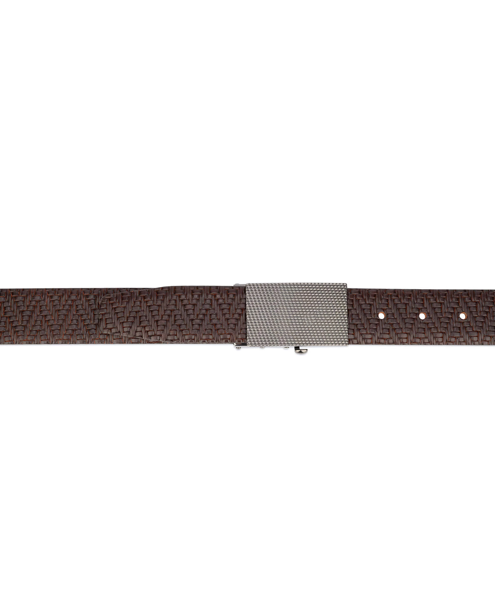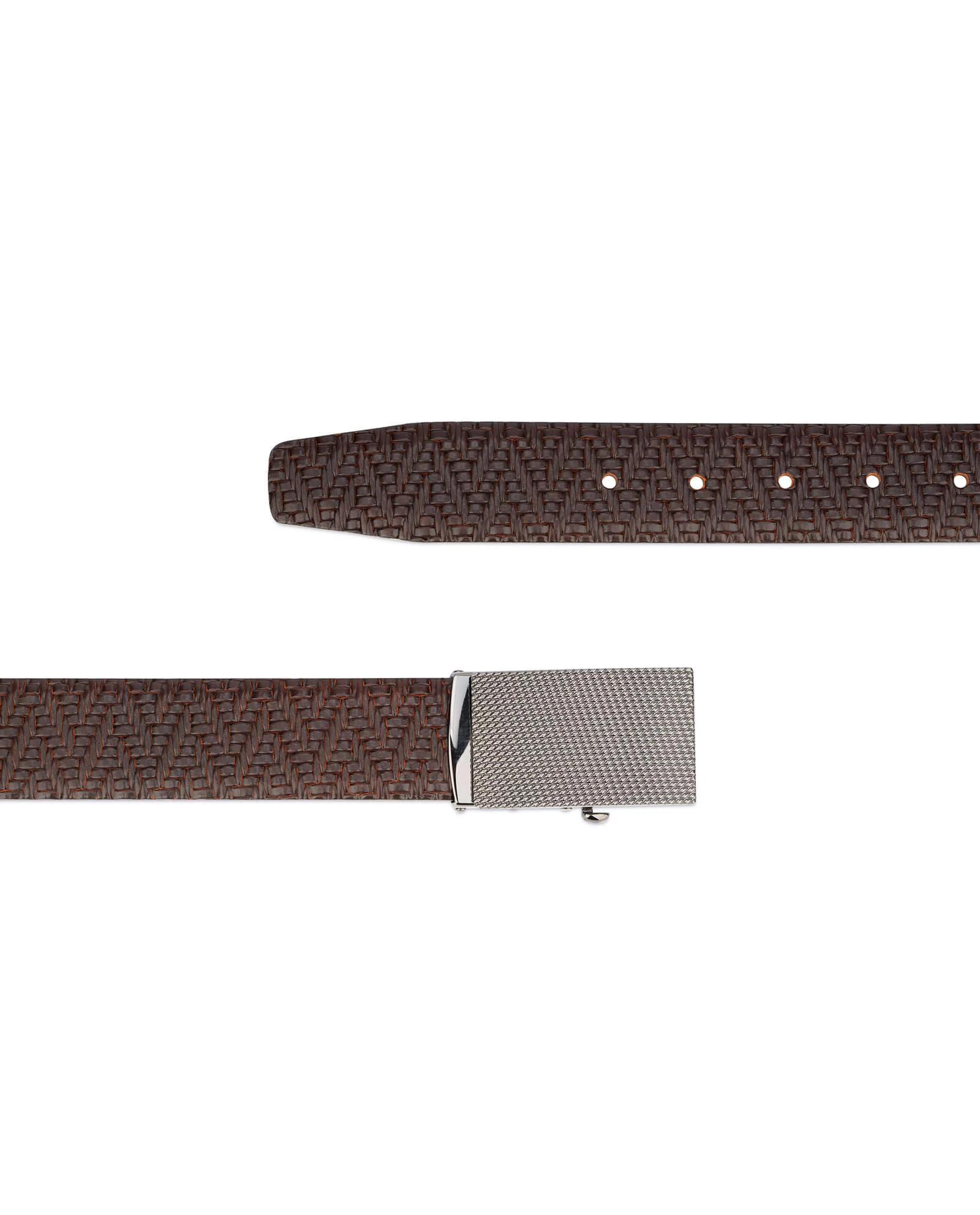 The belt is crafted out of genuine Italian leather, stamped with a braided pattern, and finished with a wax treatment. The durable construction withstands cold and hot weather alike, making this a perfect all-season belt. The strap is finished with a ratcheting belt buckle that holds on the belt securely in the fastened position all the time. The buckle lock is hidden by the faceplate which is, in fact, the main part of the design of such a belt. This automatic buckle is made of solid metal with a grid pattern on the front plate. Men’s brown belt never releases at the most inopportune moment.