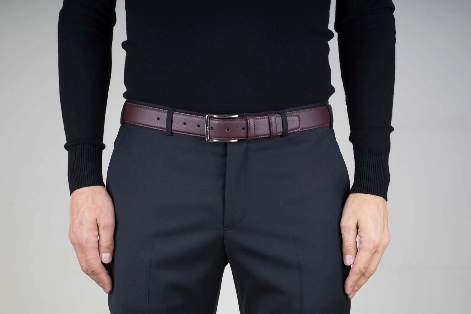 As for the latter, matching a belt to your outfit, focus primarily not on a dress pants, a shirt, or a jacket fit to it but on shoes. This is the perfect solution for a classy man. The genuine leather belt is 1 3/8″ | 3.5 cm wide and dyed in burgundy color. The leather canvas is firmly stitched with strong threads for better durability. Pre-cut holes for the buckle tongue and two leather loops deal with fasten the belt on the male waist for a perfect fit. The men’s burgundy belt is one of the huge selections of men’s belts provided by our online store. Check out other belts made by prominent Italian brands in various colors, texture, and sizes if this model doesn’t meet your current expectations.