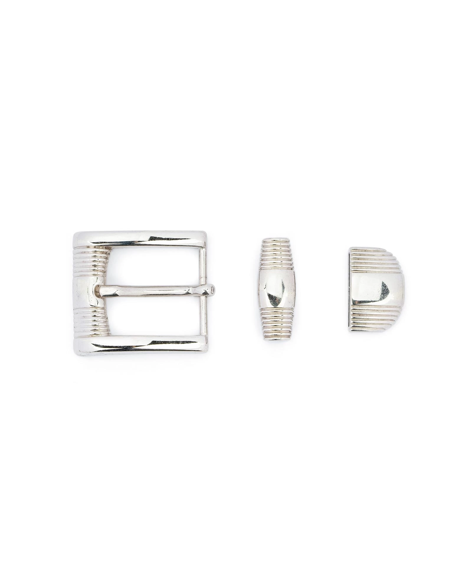 3 piece buckle set consists of three units – a buckle frame, loop, and tip. These fittings are made of durable metal and colored in silver nickel. The buckle details are decorated with embossed stripes on the top and bottom which gives the product a beautiful look. The buckle frame is designed in western-style which implies the ability to wear a finished belt with jeans. Besides, this western silver belt buckle is appropriate in a combination with formal pants or suit pants.