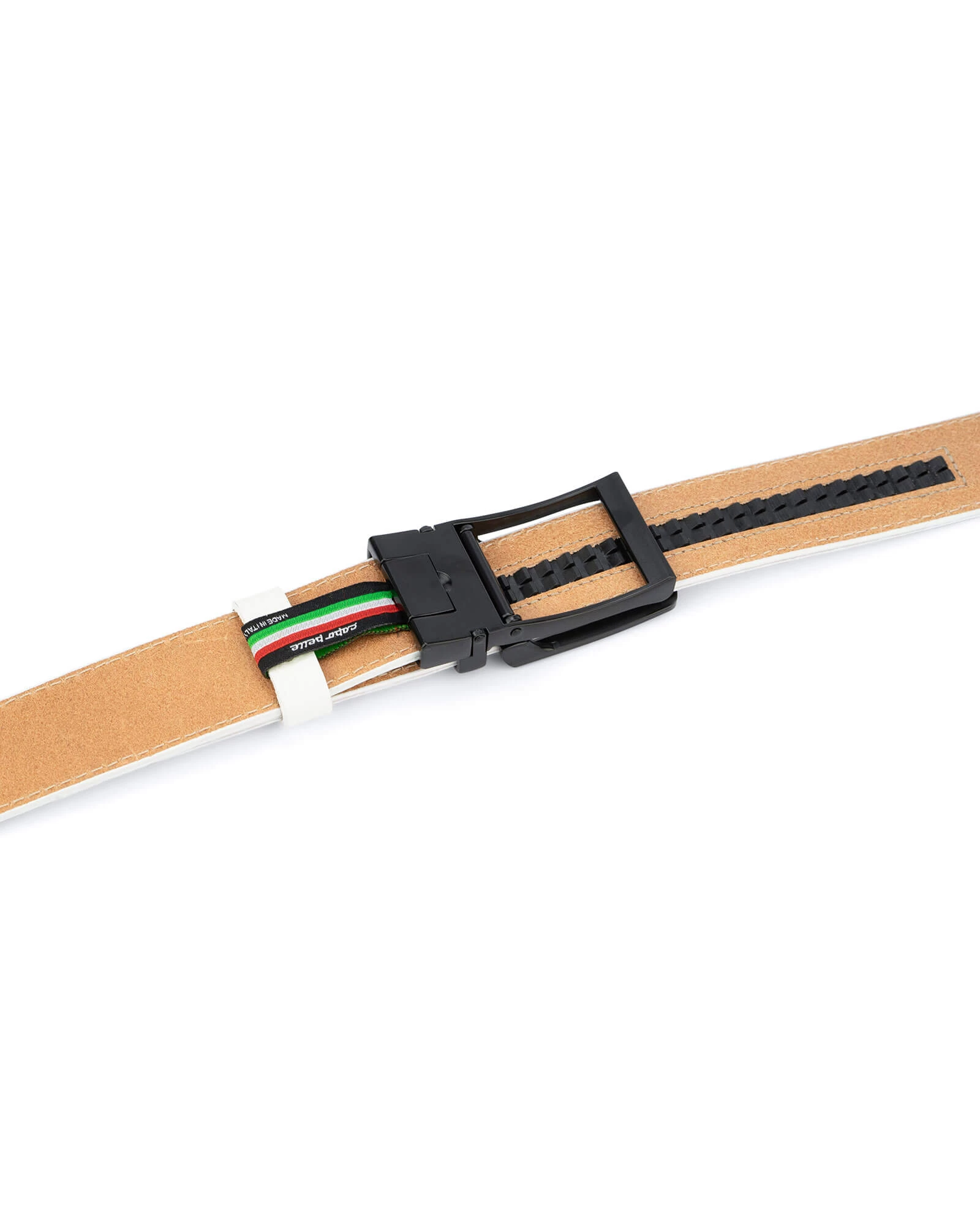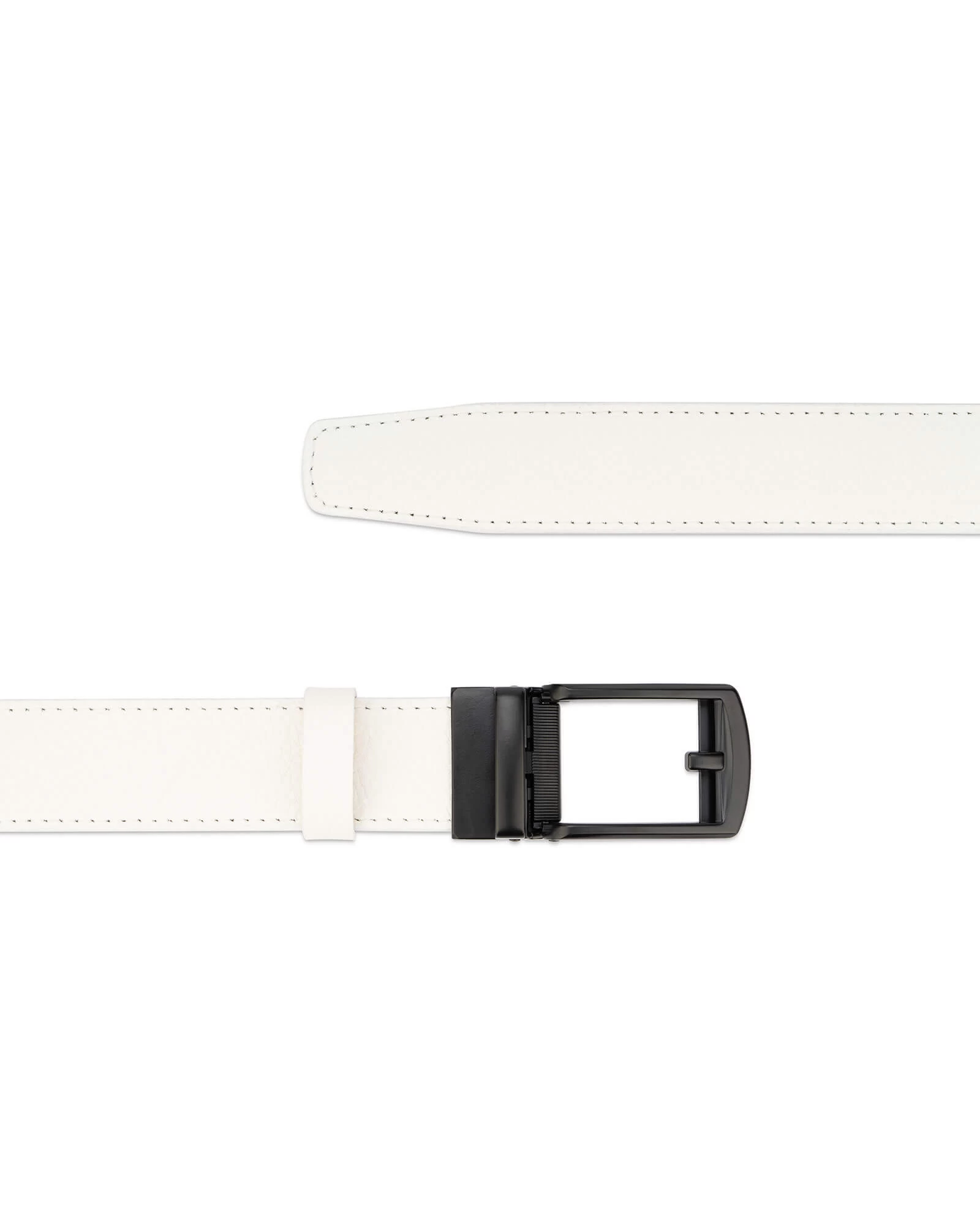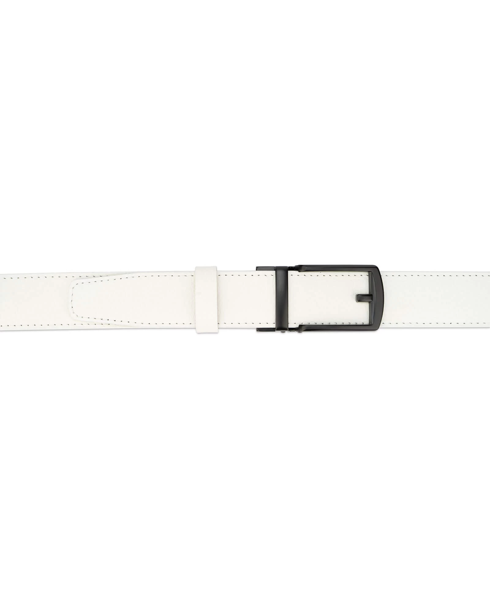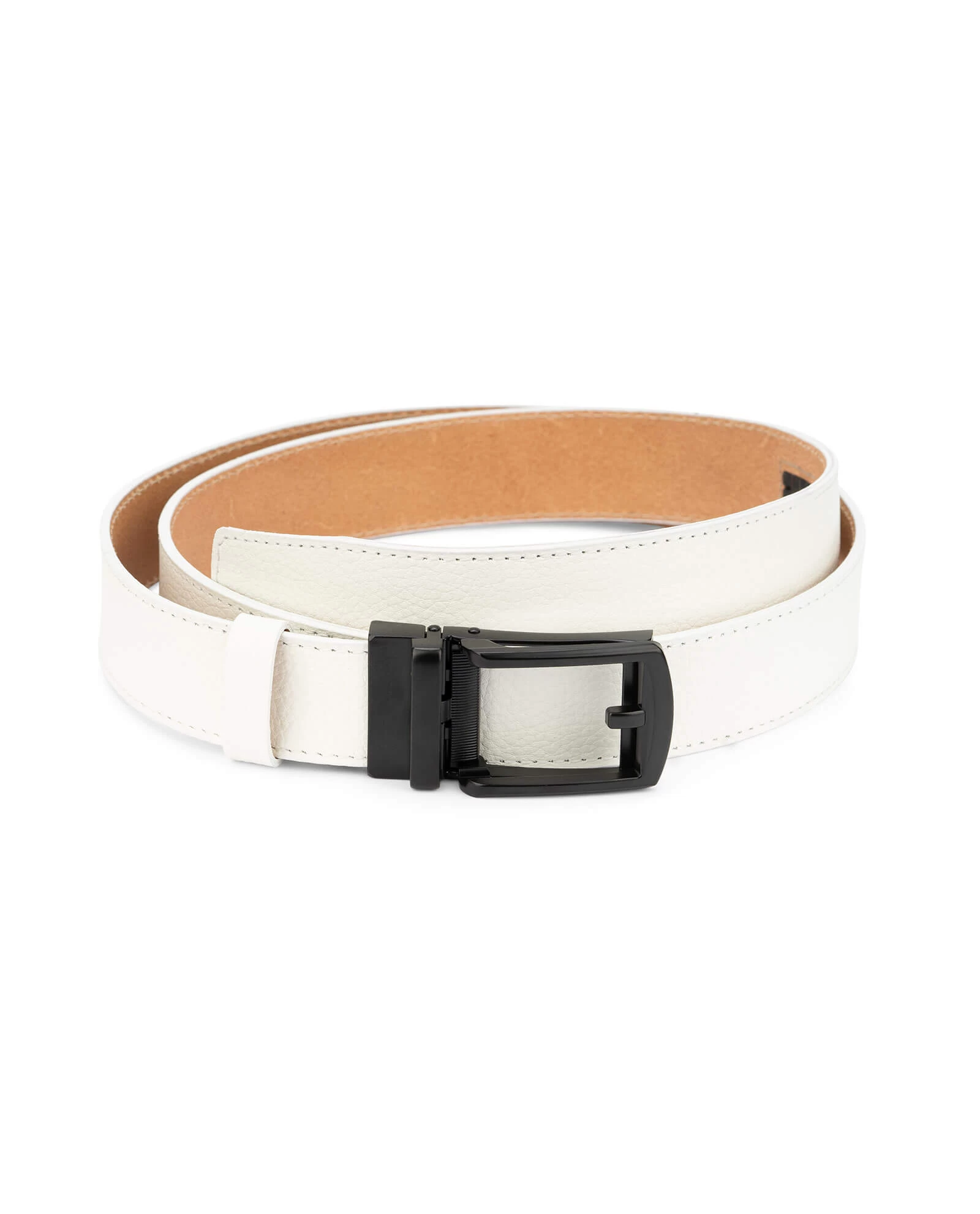 The white men’s belt is a concise accessory made of 100% Italian leather without any flashy. The smooth canvas and edges are dyed in white and stitched with durable threads giving the item a perfect look. The buckle is black and looks like a single tongue buckle at first sight. However, if you look closely, you’ll see that this is a ratchet buckle that locks into place using a mechanism inside hardware. The men’s ratchet belt gives the user the freedom of having adjustments in size as well as lasts much longer than traditional belts. No more punching holes in leather, long live a clean belt without traditional holes!