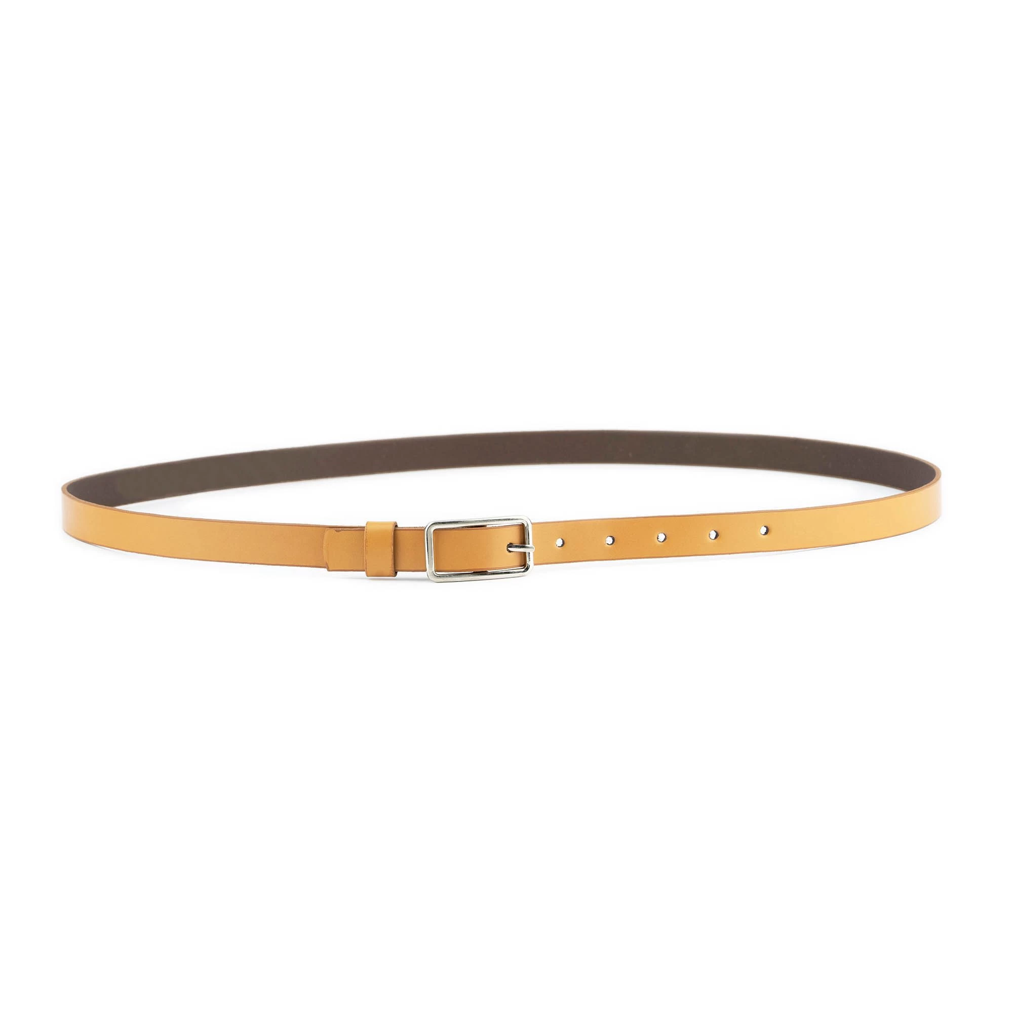 Buy Mustard Lady Leather Belt Skinny at LeatherBeltsOnline.com – 5/8″ (1.5 cm) wide – Mustard color – Genuine leather – Silver color buckle – Model code MUSSKI15SMOGAL