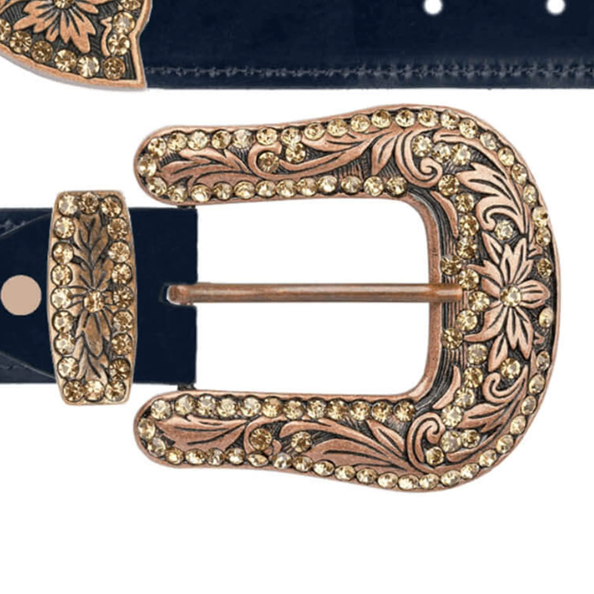 Buy Navy Blue Leather Belt With Brown Copper Rhinestone Buckle at LeatherBeltsOnline.com