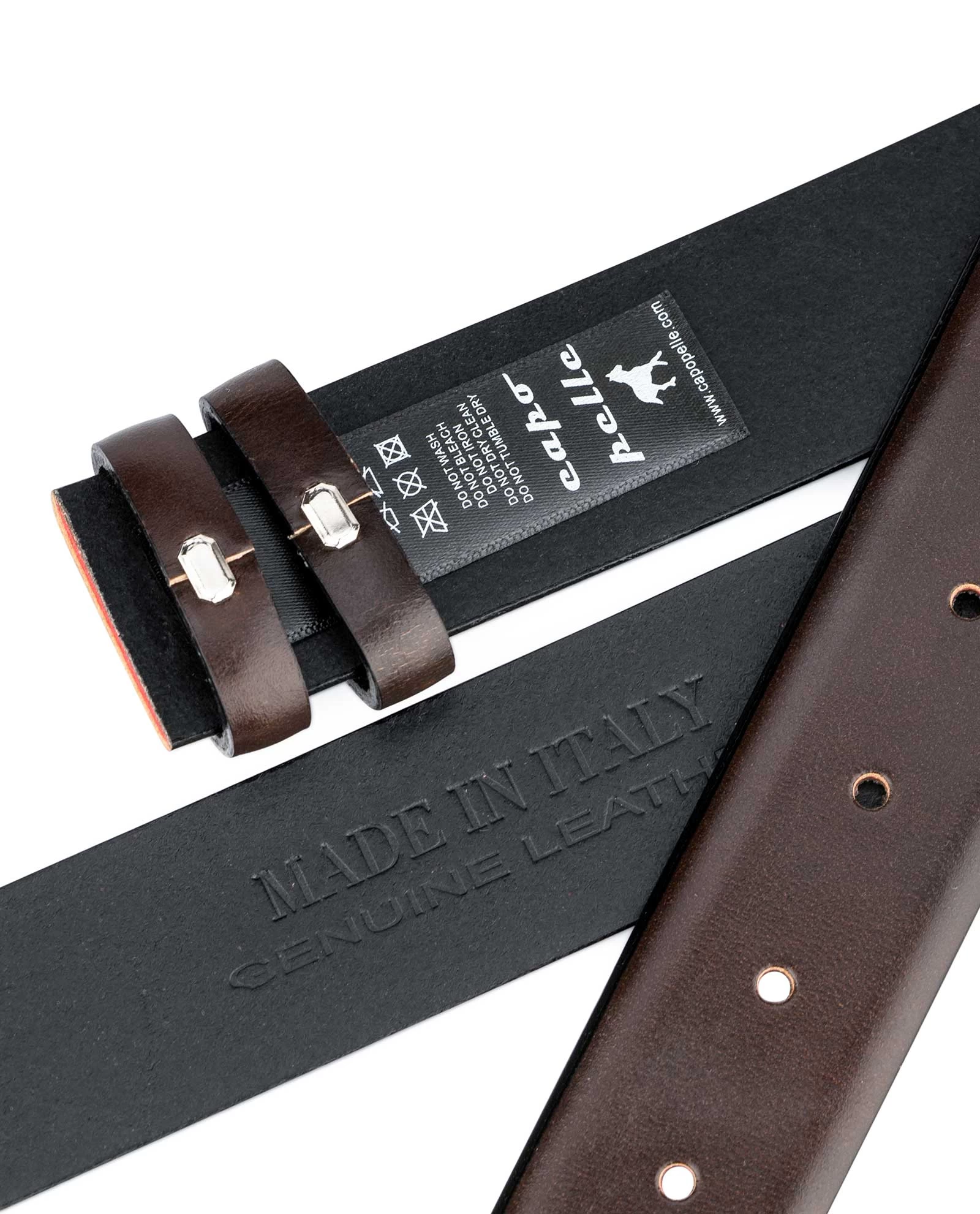 Replacement brown vegetable tanned leather belt strap presented by Capo Pelle brand is made with a classic minimalistic tone. This men’s belt strap height is 1 3/8 (35 mm). Due to the fact that this item does not have a buckle, you are free to choose any of matching belt buckles that are listed on our website to create a unique outfit for any occasion.