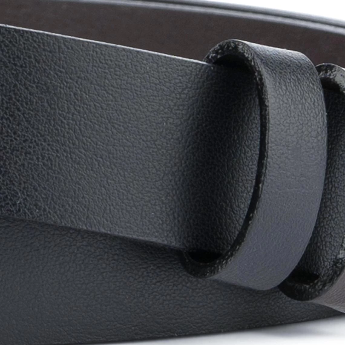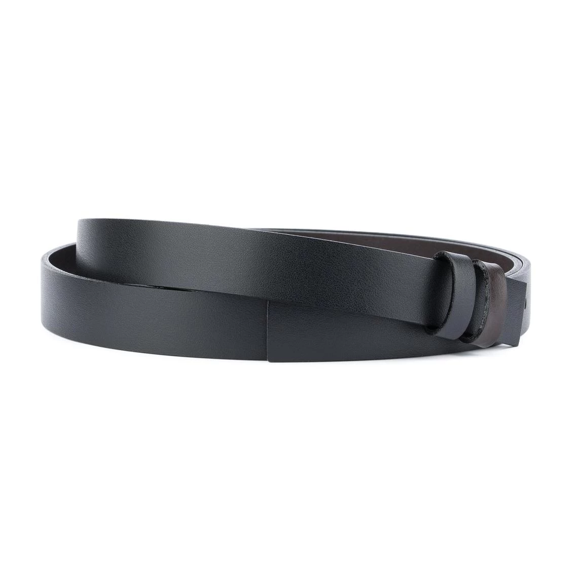 This men’s reversible belt embodies both luxury and modernity. The model is crafted out of genuine Italian leather, hand-stained in two colors, and polished to a high sheen. Two leather keepers of black and brown colors provide pizzazz to this strap and serve to adjust the belt in a comfortable place. This skinny strap suits all types of bodies and can easily withstand rough activities. The length of the no buckle leather belt can be cut by means of scissors to make it fit if necessary. The belt strap can be paired with any type of buckle, for example, with a pin buckle, a clip buckle, or a reversible buckle. This timeless belt strap is a win-win option in men’s wardrobe since the item is easy to match different outfits.