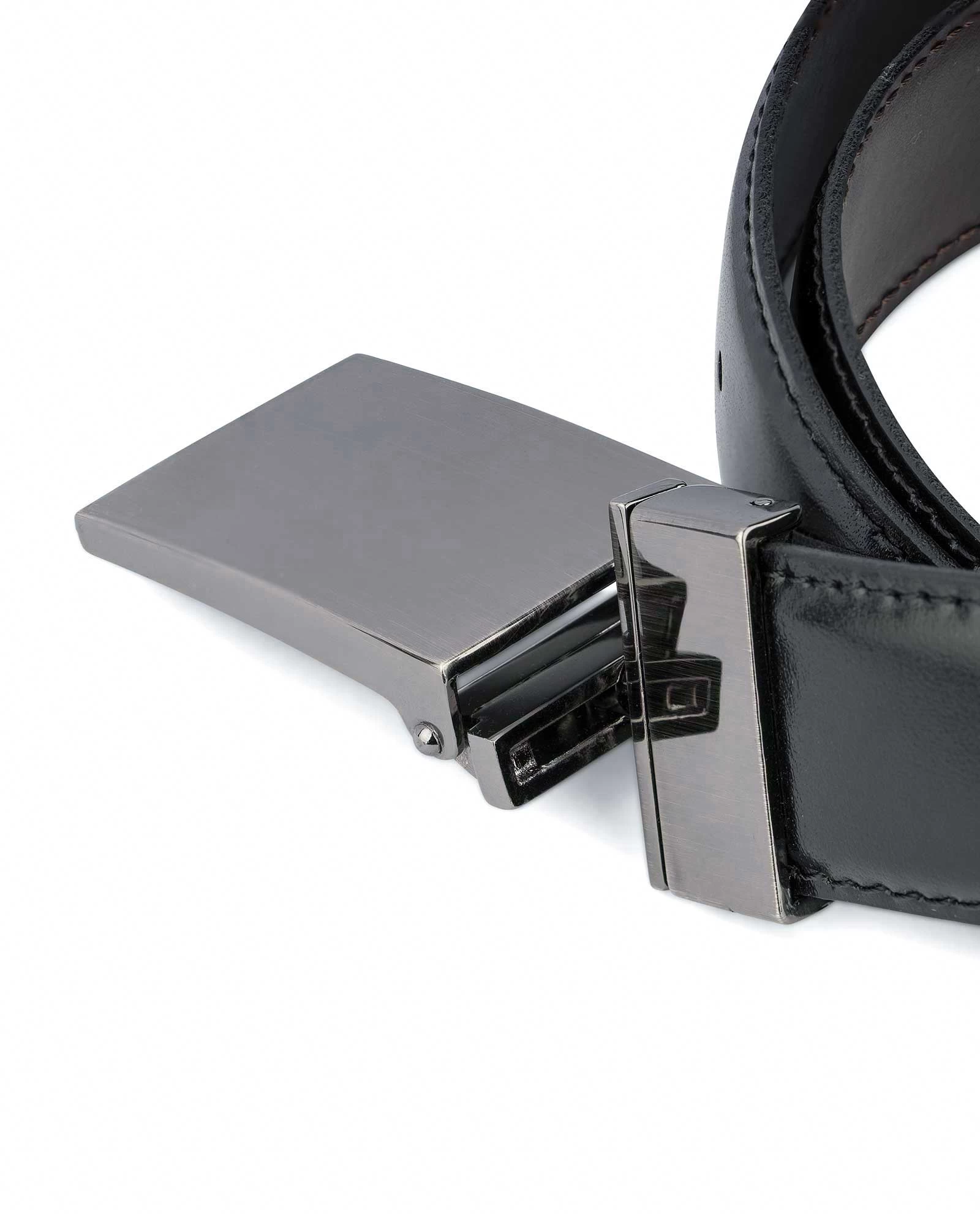 The belt comes with a swivel buckle, its minimalistic rectangular shape, and gunmetal gray color look fresh and trendy. Just one tip: this is one of those menβs leather belts that are great for creating modern and classy outfits with some degree of chic: add it to simple black (or brown) trousers to look fashionably sophisticated.