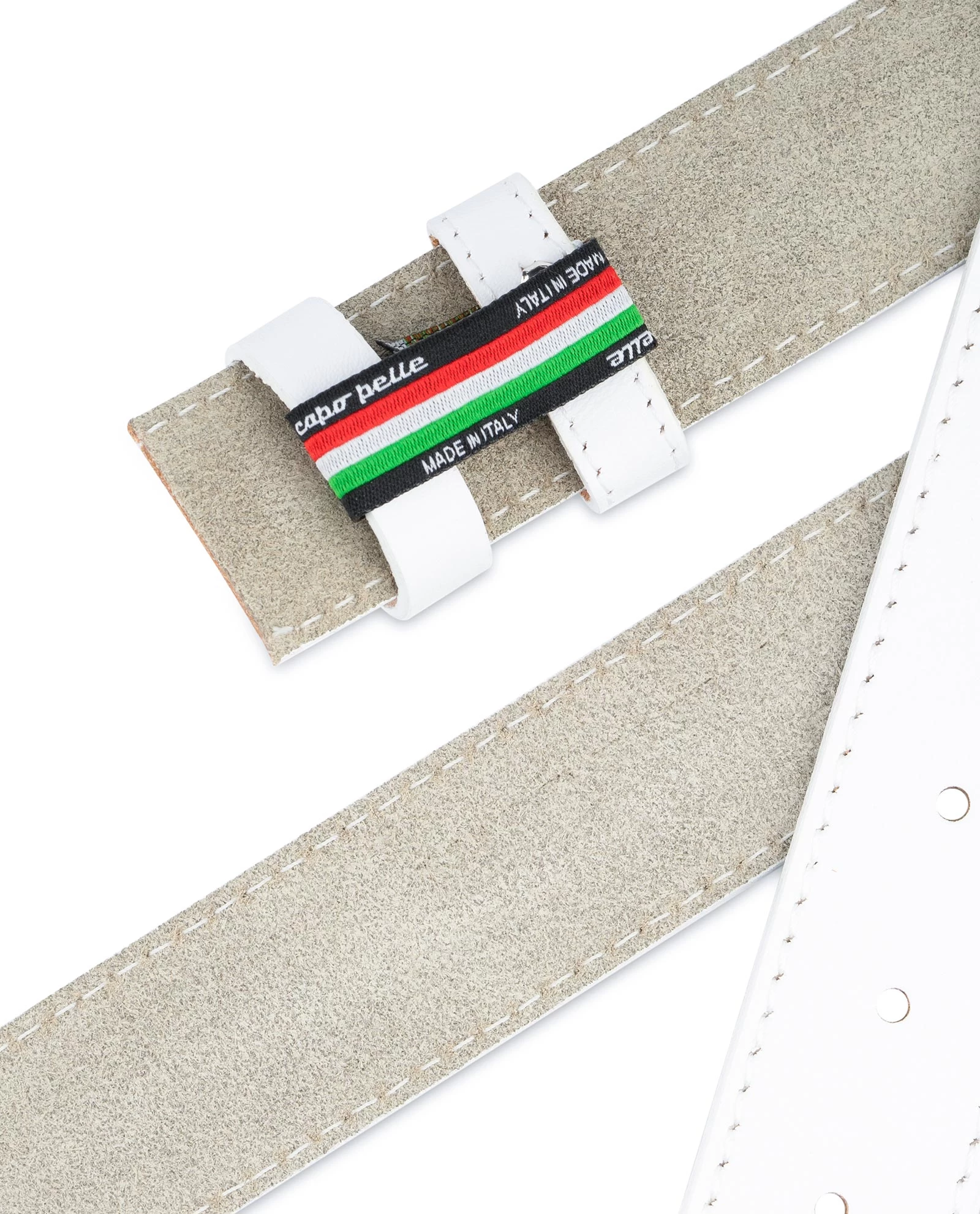 White men’s belt without buckle is an easy solution for those who don’t already have a belt for light & snow-white outfits. This 1 3/8 inch width belt by Capo Pelle, a reputed Italian leather brand, combines practically a summer fashion and completes any look. It perfectly complements not only your chinos and lightweight suits but matches your jeans. A white replacement belt straps made of excellent smooth leather will easily become a stylish accessory if you attach your favorite buckle on it or buy a new one you like on our website. It is easy to rearrange the buckle yourself or you may seek help at any leather repair service. It should be noticed that the width of the buckle and belt be matched equally.