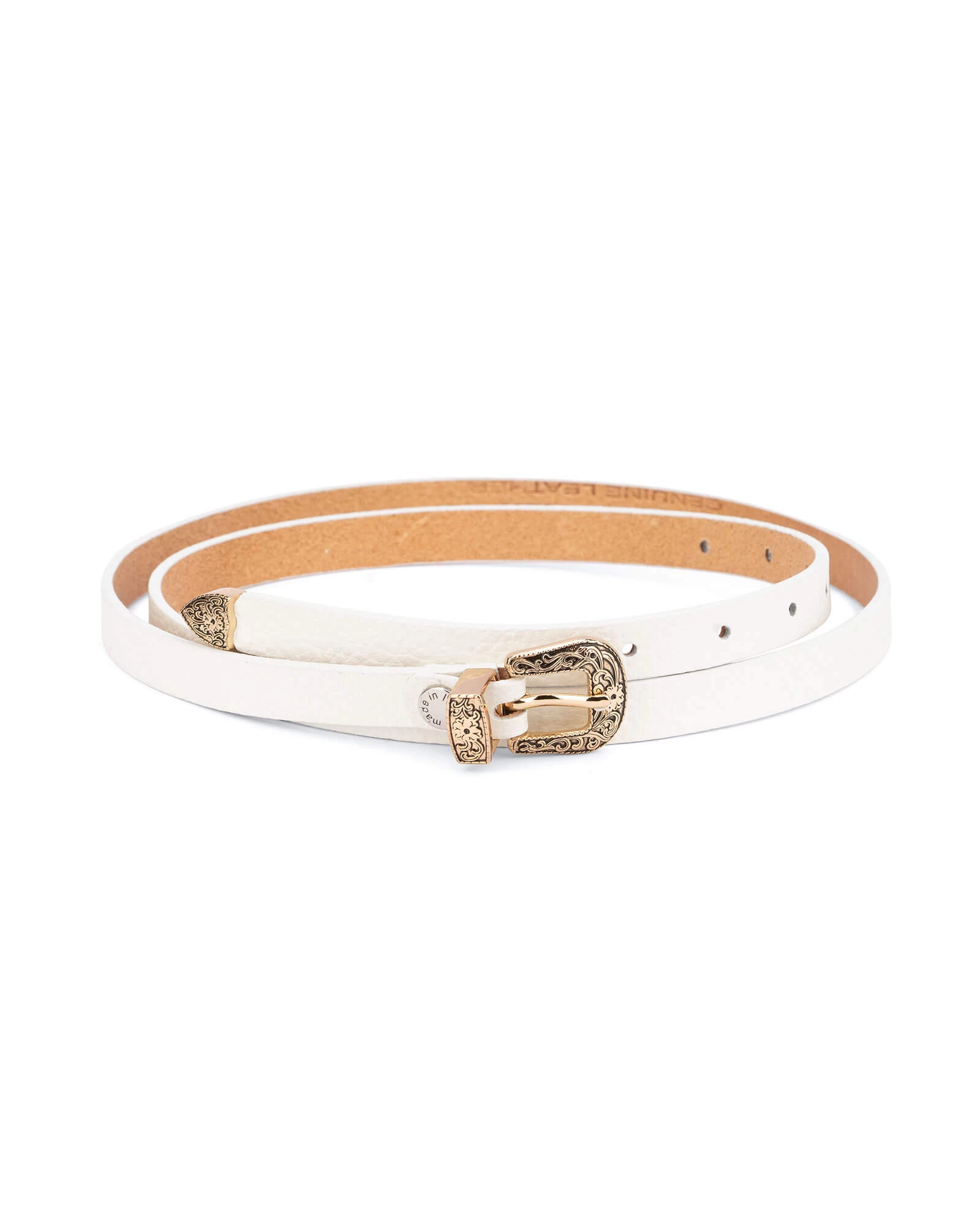 The Capo Pelle artisans have used 100% genuine, eco-friendly leather in the belt’s production that has a leather odor, not chemicals. The women’s white leather belt is 5/8″ | 1.5 cm wide, so it fits well through any pants loops. The bright gold buckle in western style, one loop, and some pre-cut holes for a buckle tongue are designed to hold the belt in place whether it is a waist or hips. Gold patterned hardware gives the item a unique touch while the metal end tip gives the belt a complete look.