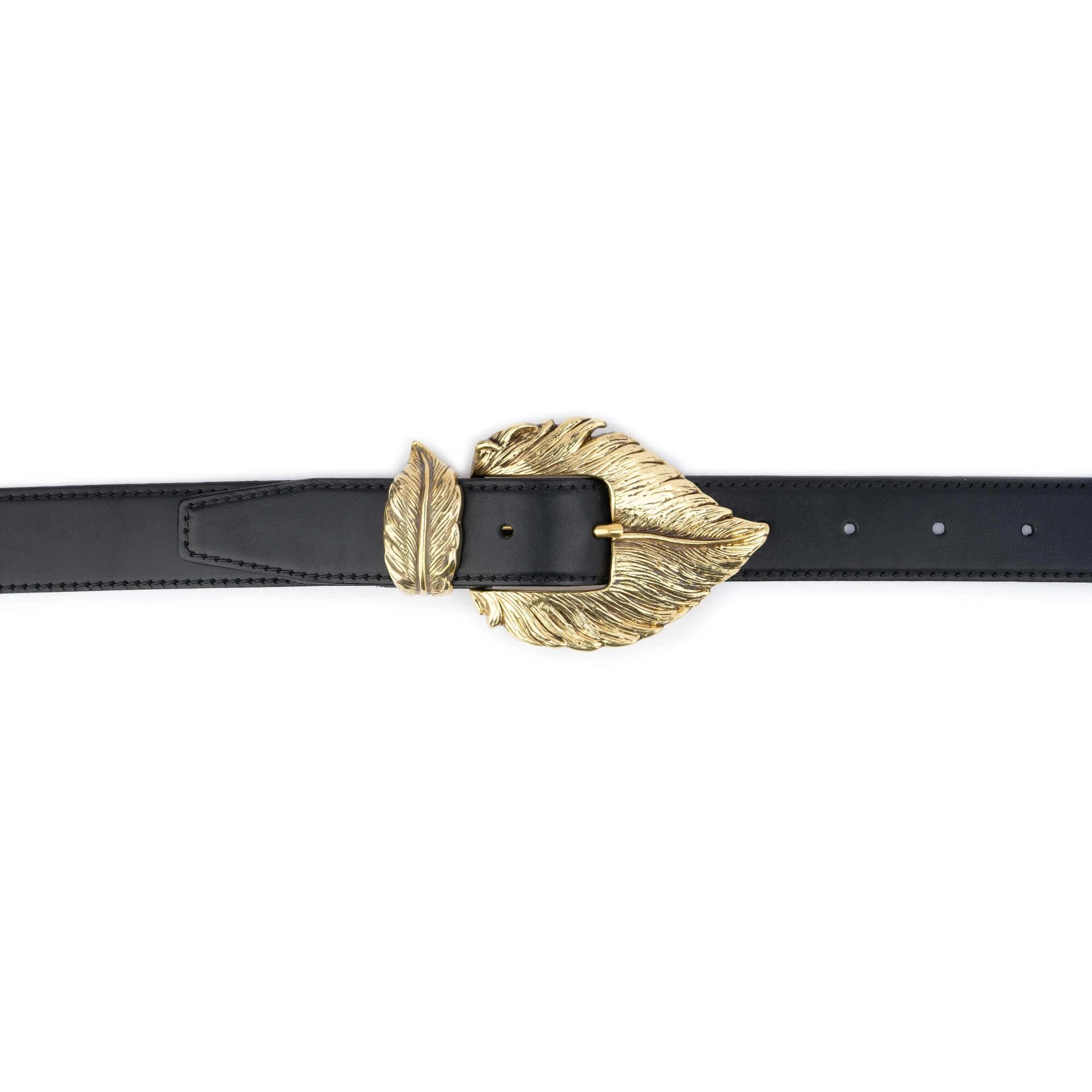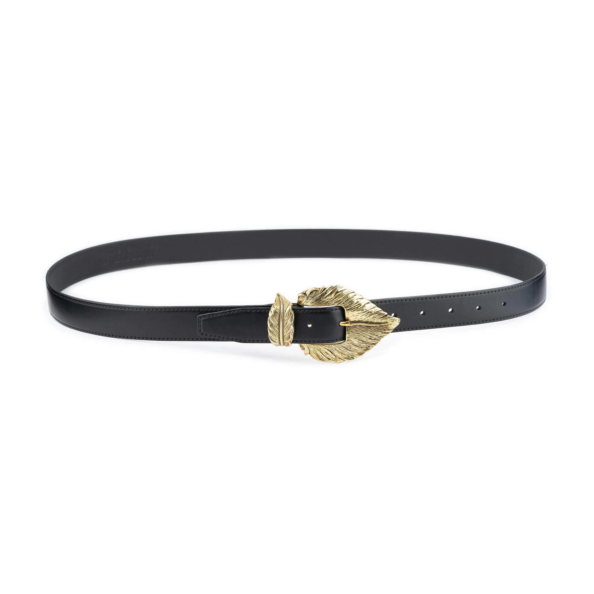 Buy Womens Black Belt With Gold Feather Buckle at LeatherBeltsOnline.com